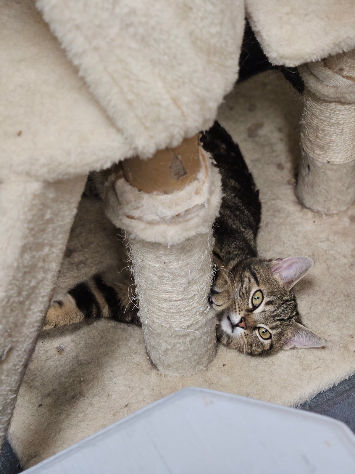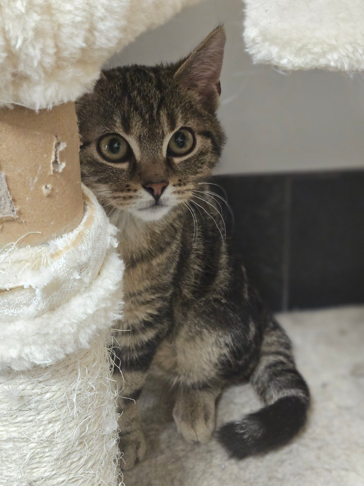 Babaloo aktualnie częściej obserwuje nas z ukrycia niż spędza z nami czas. Jednak pozwala się dotykać, tylko po prostu jeszcze boi się ludzkiej ręki. Już powoli budujemy jego pozytywne skojarzenia, próbujemy się z nim bawić, maluch już nawet polubił sosiki. To młody kot, więc z pewnością w nowym domu bardzo szybko się przełamie. Będzie potrzebował tylko chwili cierpliwości.