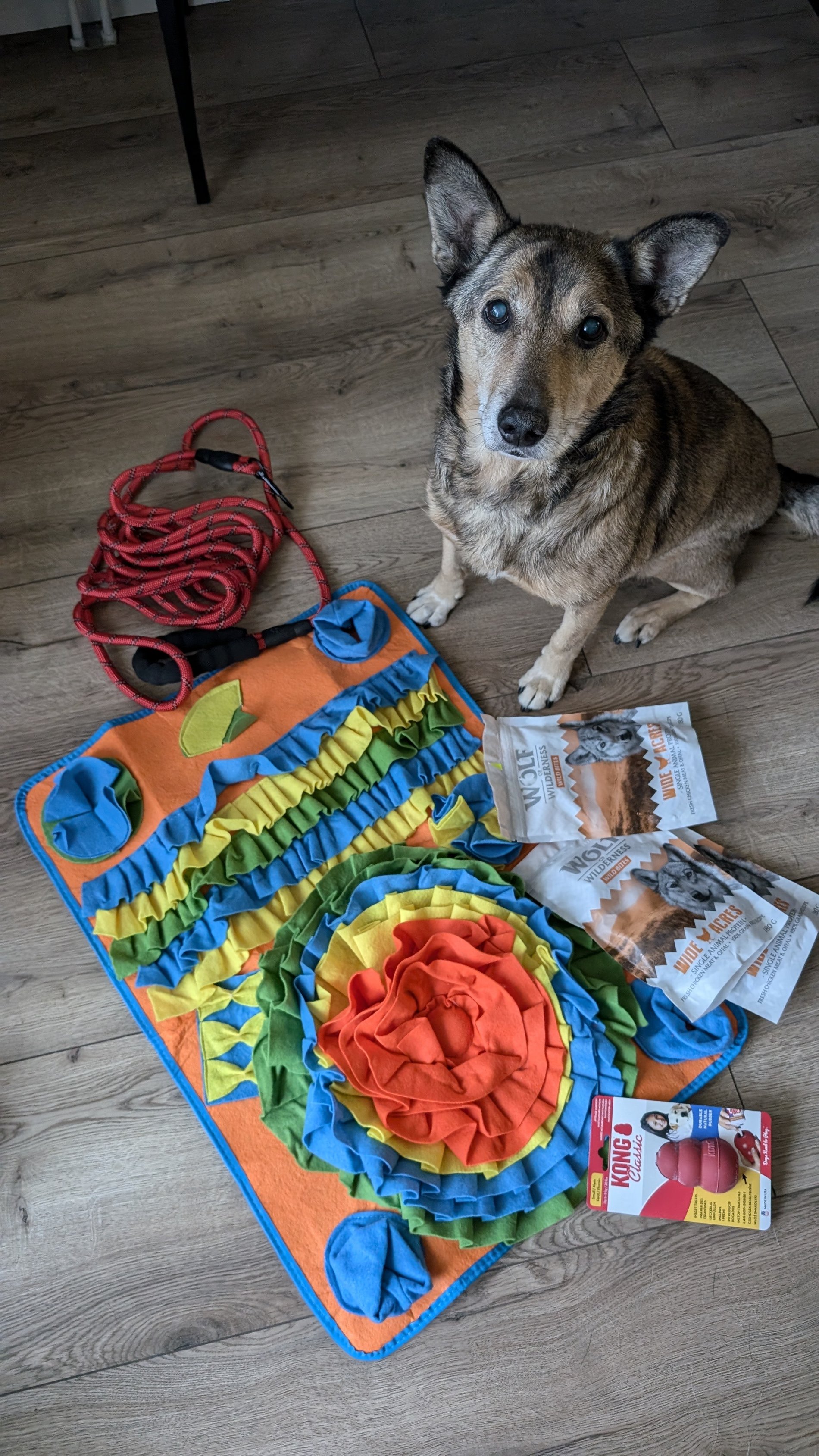 Lękowo reaguje na inne psy, ale pracujemy nad tym i doświadczenie pokazuje, że po bliższym zapoznaniu, potrafi oswoić z innym czworonogiem. Łaknie kontaktu z człowiekiem, lubi być miziany, ale raczej nie nadaje się do domu z małymi dziećmi.