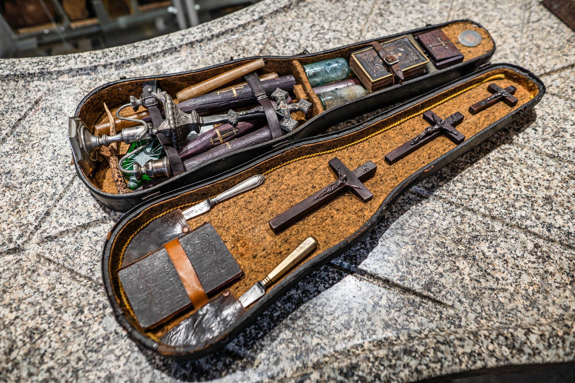 – Szczyt zainteresowania tematyką wampiryczną przypada na lata 1900-1920 oraz lata 50 XX wieku, choć obecnie również motyw wampira przeżywa renesans w sztuce filmowej – opowiada dr Jędrzej Siuta z Zakładu Medycyny Sądowej UMW, opiekun Muzeum Medycyny Sądowej. – Bardzo popularne były wówczas podręczne zestawy służące do zwalczania wampirów, sprzedawane w walizach, skrzynkach albo - jak nasz – futerałach na skrzypce. Chodziło o to, by można było łatwo się z nimi przemieszczać i działać w razie potrzeby w miejscu, gdzie znajdują się zwłoki.