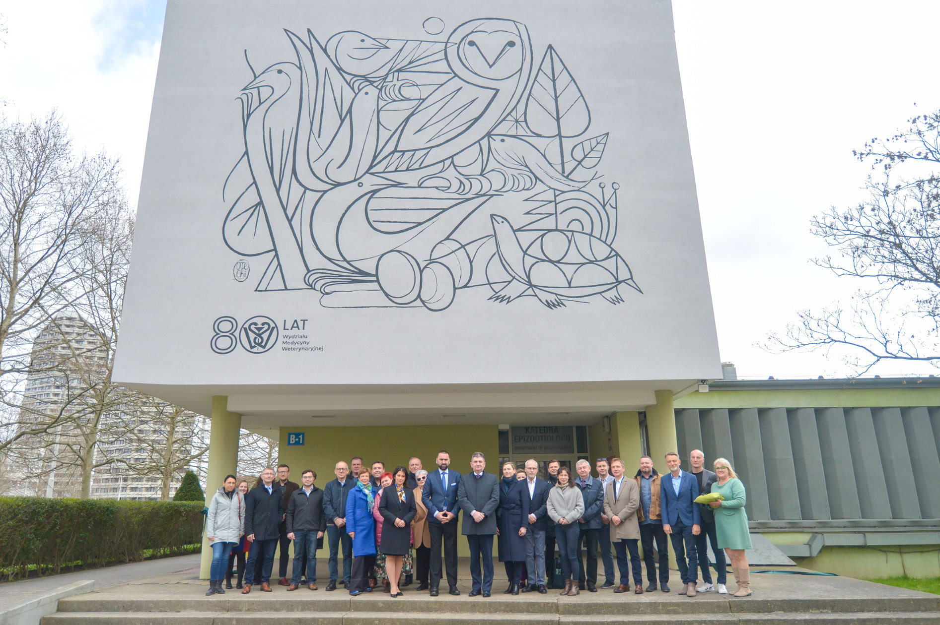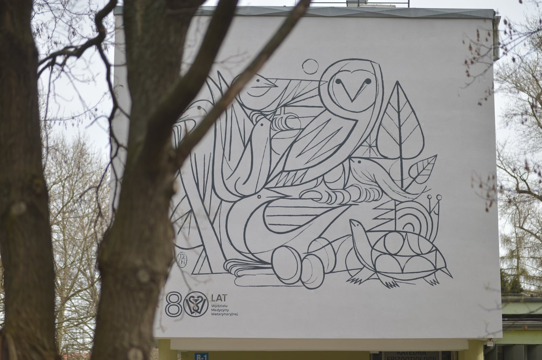Nowy mural pojawił się na jednym z budynków Uniwersytetu Przyrodniczego, a konkretnie na siedzibie Katedry Epizootiologii z Kliniką Ptaków i Zwierząt Egzotycznych (Pl. Grunwaldzki 45). Powstał z okazji jubileuszu 80-lecia Wydziału Medycyny Weterynaryjnej UPWr i we wtorek (31 marca 2026 r.) został uroczyście odsłonięty.