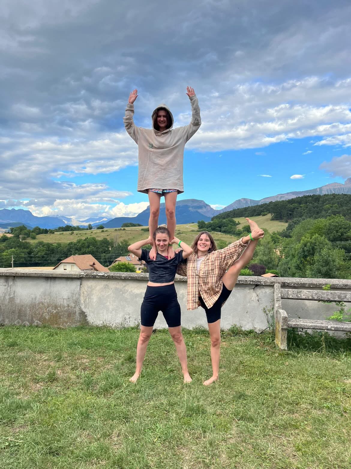 ASTStudentki wykonują figurę akrobatyczną na trawie. Z tyłu widać piękny górski pejzaż.