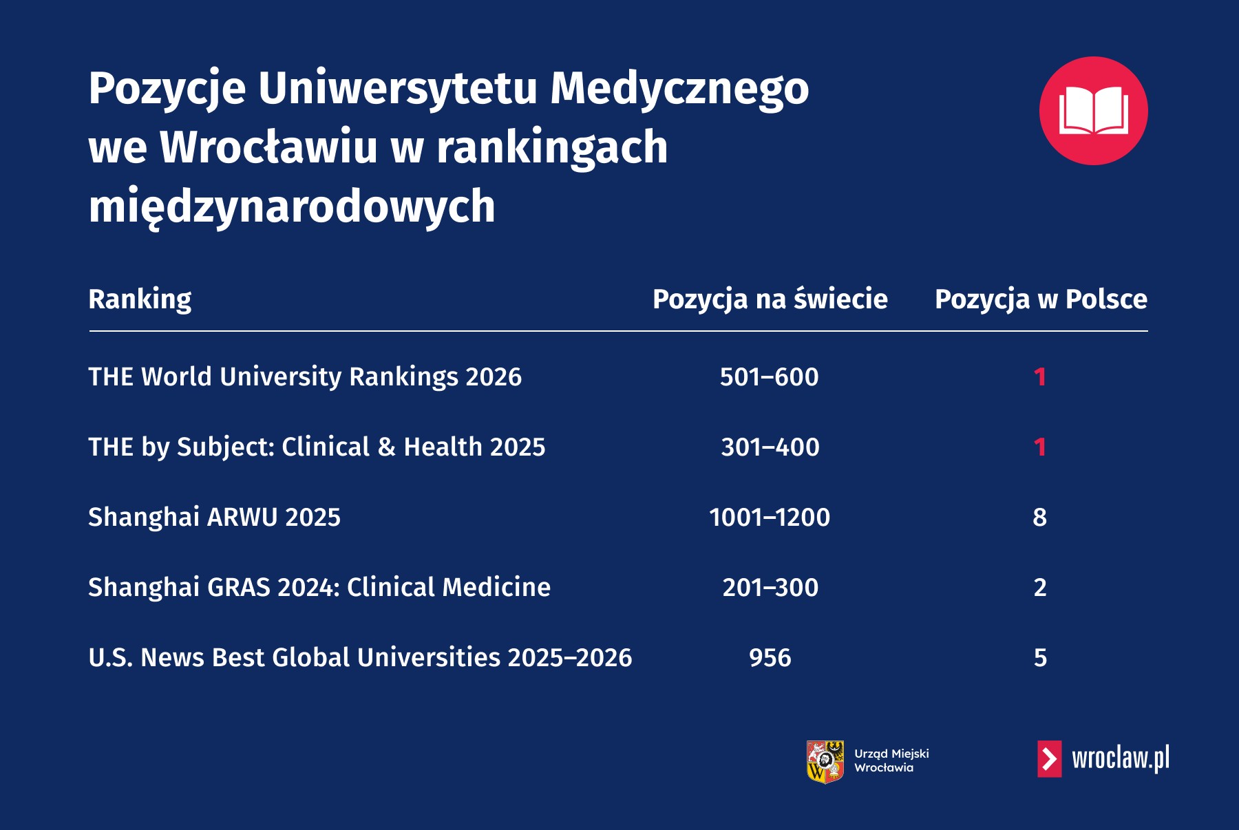 - Uniwersytet Medyczny we Wrocławiu zajął 1. miejsce w kraju oraz znalazł się między 501-600 miejscem na świecie w rankingu Times Higher Education World University Rankings 2026;