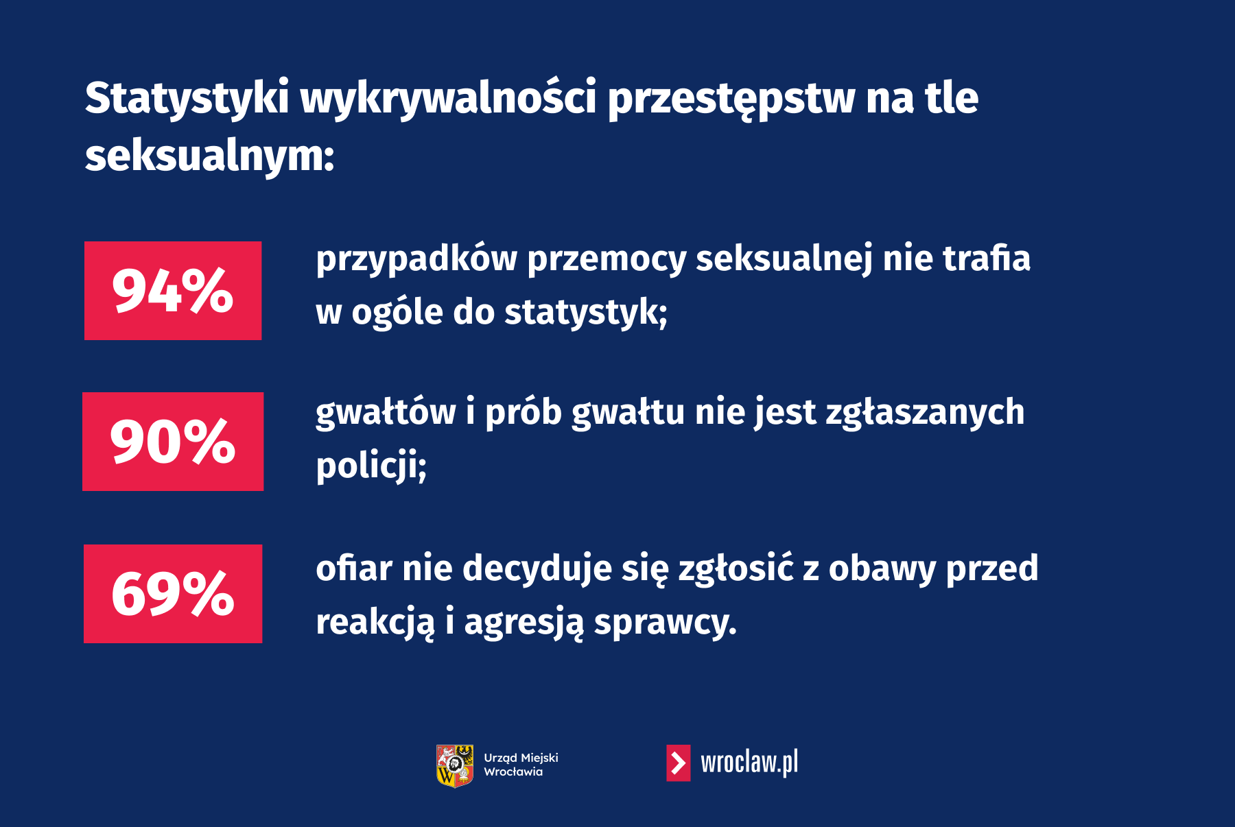 Tylko w zeszłym roku, polska policja potwierdziła 1047 przestępstw polegających na gwałcie lub wymuszeniu czynności seksualnych. – Jeśli wziąć pod uwagę, że pozostałe 90 procent przypadków nie jest w ogóle zgłaszanych, to te liczby są wstrząsające — zauważa Magdalena Wdowiak-Urbańczyk, dyrektorka Departamentu Spraw Społecznych UM Wrocławia.