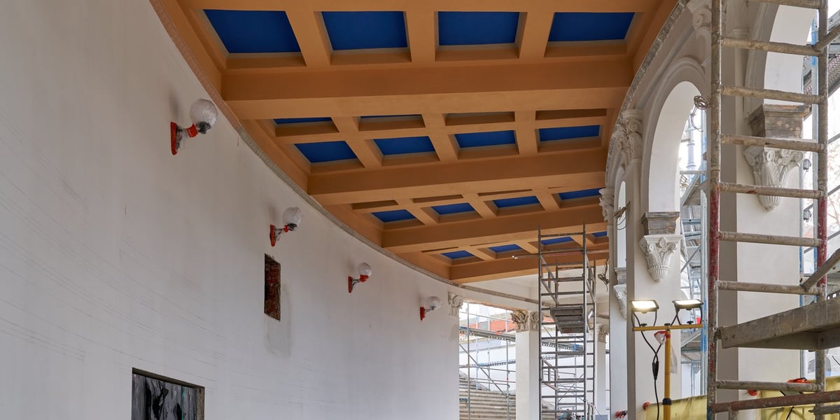 Die Farbproben wurden vor Ort analysiert: Die Anstriche wurden mit zeitgenössischen Farben nach den Angaben der Forschung direkt im Inneren der Säulenhalle gemalt. Die eher kräftigen Farbkombinationen wurden durch eine Überprüfung abgeschwächt, überwiegend auf der Grundlage des Originalputzes mit dem bei den Arbeiten entdeckten Originalanstrich erfolgte.“