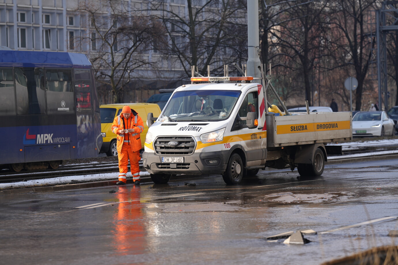 Na miejscu pracują funkcjonariusze WRD KMP Wrocław oraz odpowiednie służby. Trwają czynności mające na celu zabezpieczenie terenu i przywrócenie przejezdności. Prosimy kierowców o omijanie wskazanego rejonu i stosowanie się do poleceń służb.Wrocławska Policja