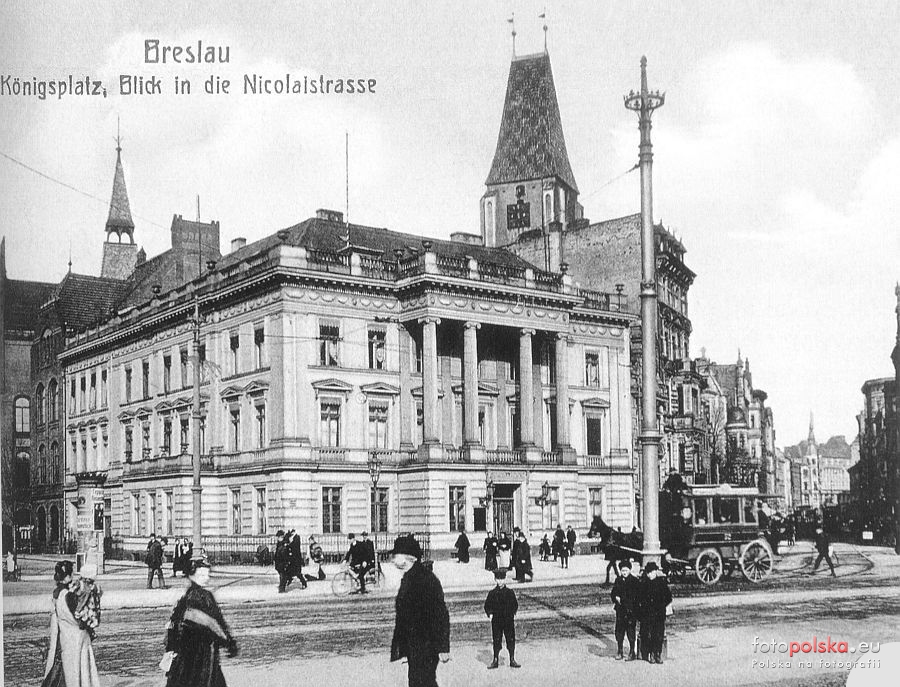 Rok 1916, pl. Jana Pawła II, po lewej stronie widać bank braci Alexander (Bank Alexanderhaus) – wzniesiony w 1827 r. w miejscu zburzonej Bramy Mikołajskiej, uszkodzony w czasie Festung Breslau, ostatecznie rozebrany pod koniec lat 60. XX w. Za nim jest wieża kościoła św. Barbary, a po prawej stronie fontanna Alegoria Walki i Zwycięstwa.