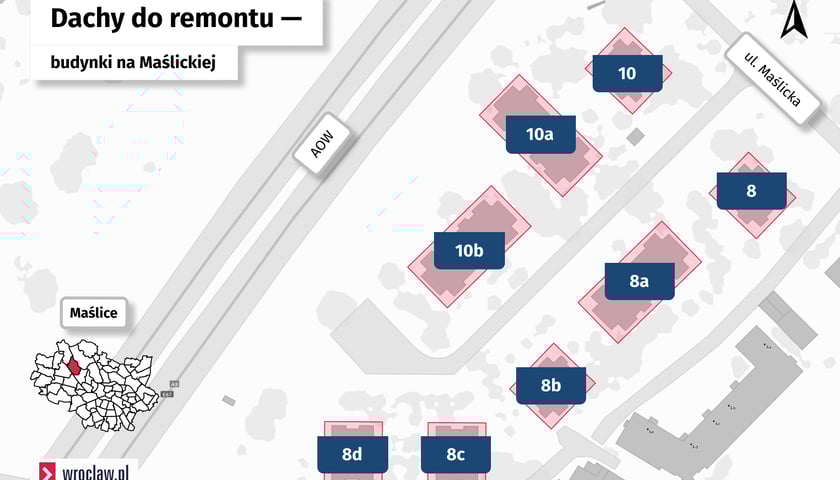 Prace czekają także dachy budynków przy ul. Maślickiej (8, 8a, 8b. 8c, 8d, 10, 10a, 10b). Ich zakres obejmie: