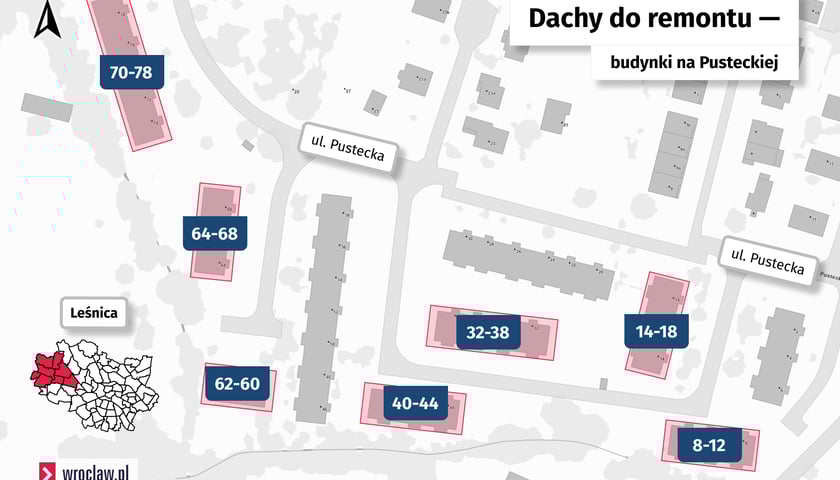 Remonty obejmują 15 dachów. To budynki przy ul. Pusteckiej (8-12, 14-18, 32-38, 40-44, 60-62, 64-68, 70-78) na Leśnicy. Tam wykonawca ma wymienić dachy z gontów bitumicznych na blachodachówkę oraz: