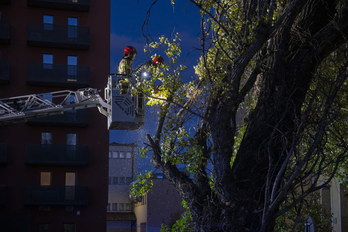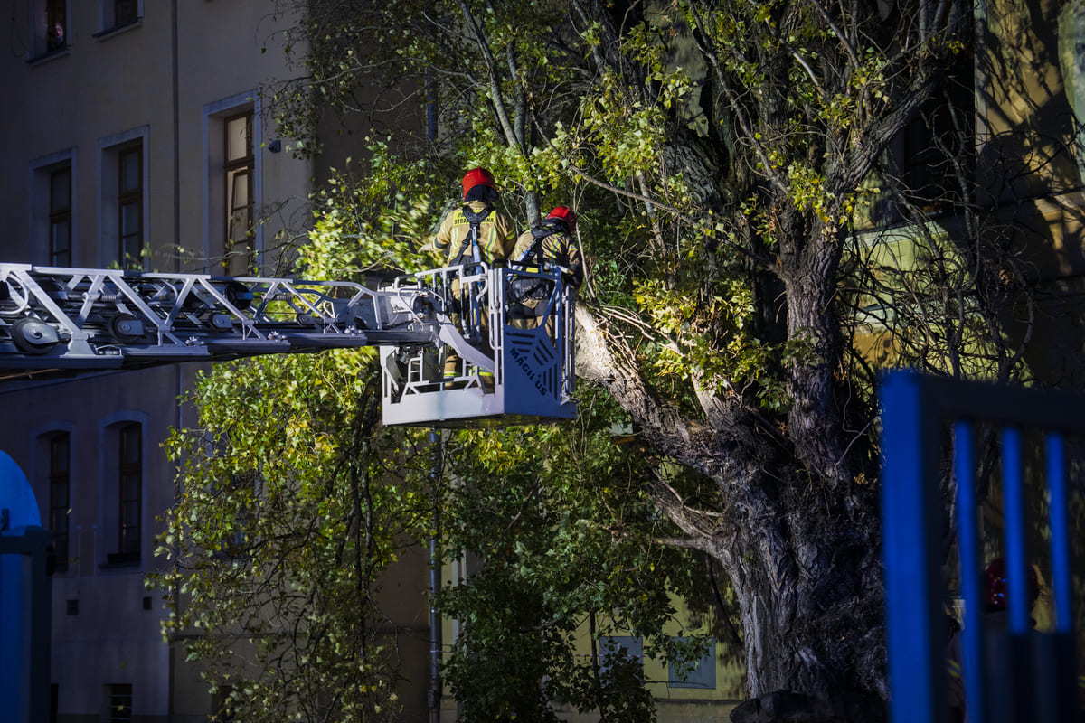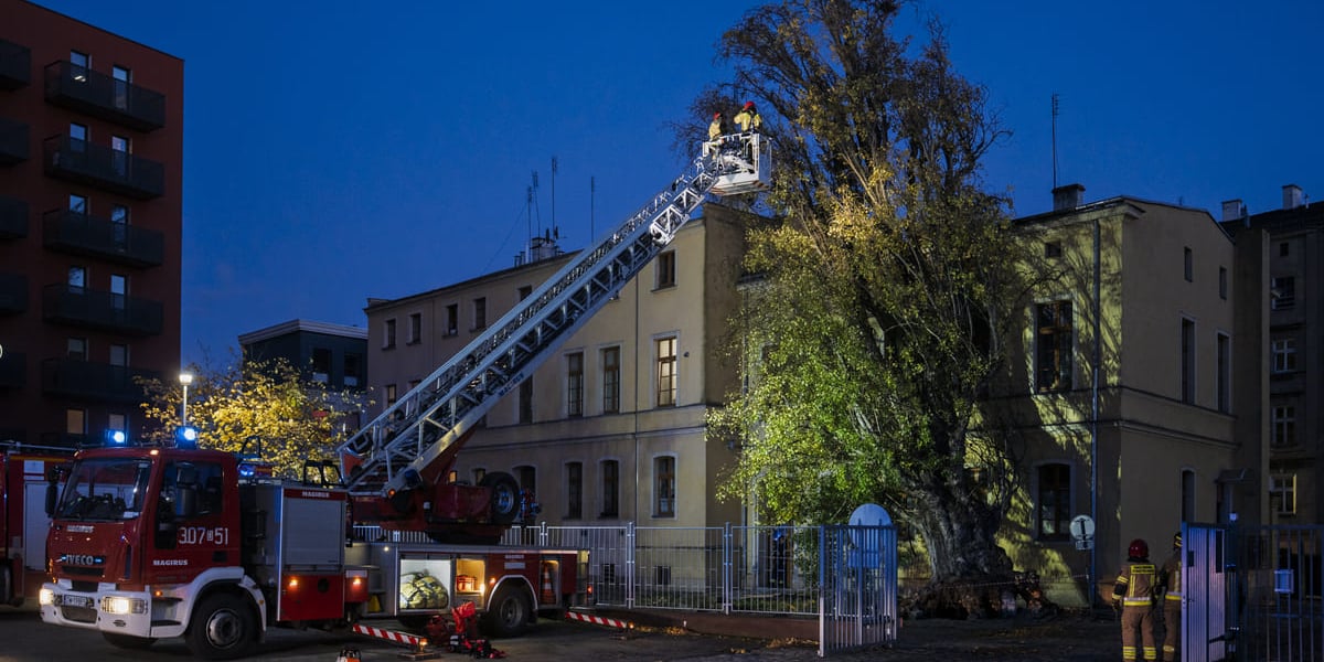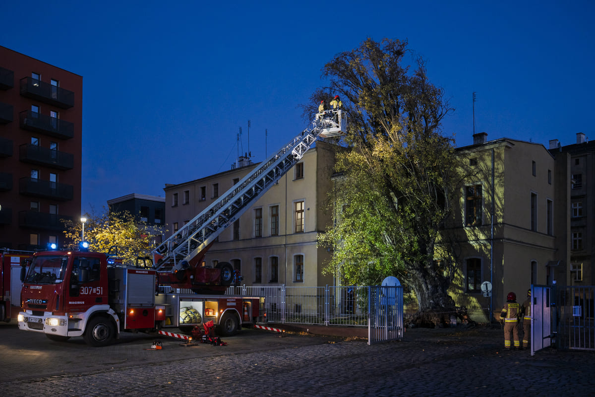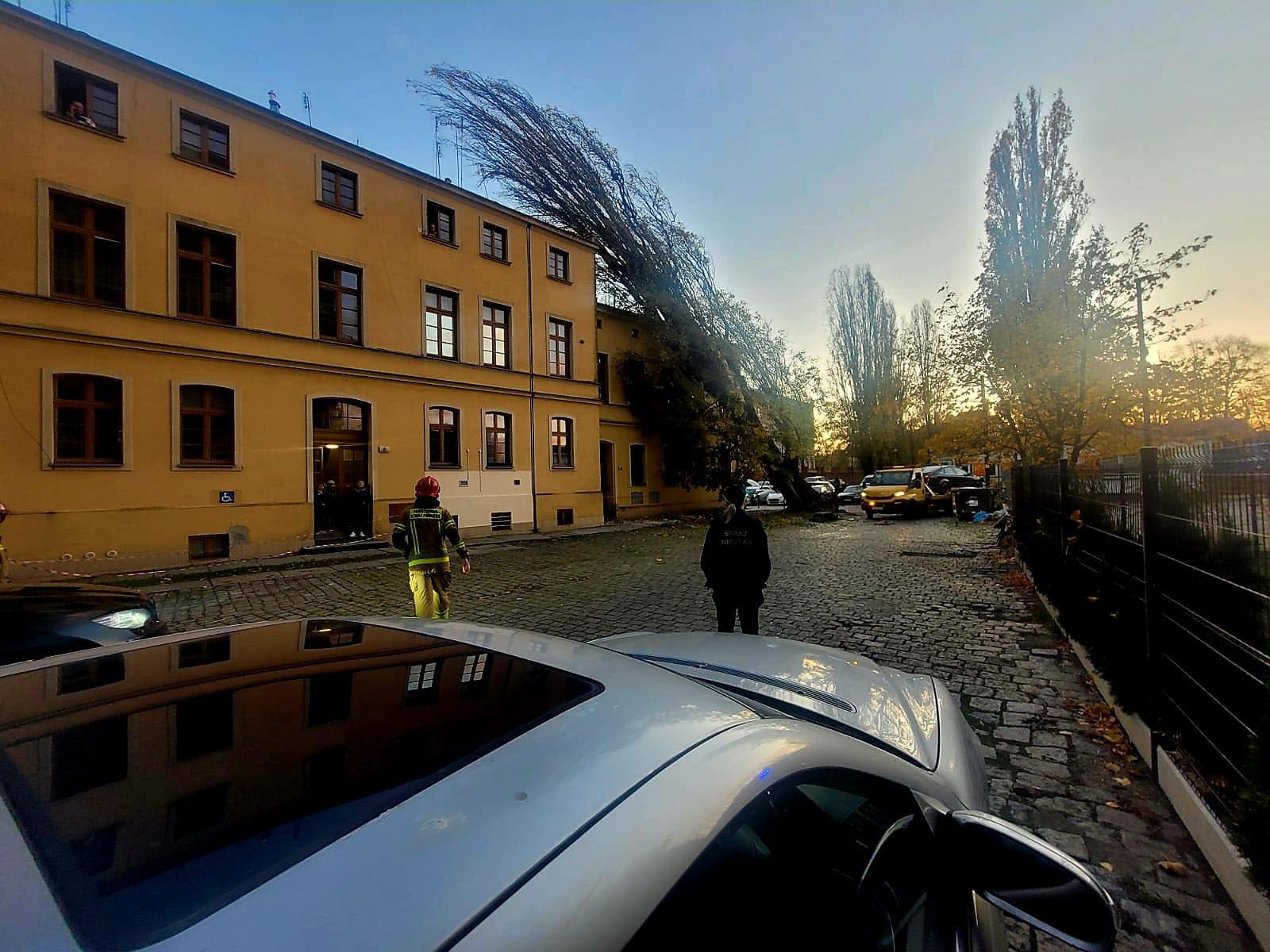 Przy ulicy Tęczowej 31 drzewo runęło na budynek. To rezultat przechodzącej przez Wrocław 30 października wichury. Straż Pożarna przystępuje do jego usuwania.
