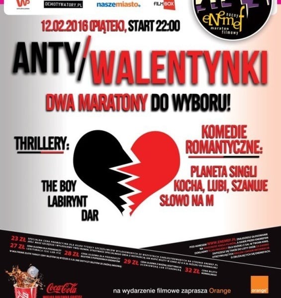 - 1 podwójne zaproszenia na ENEMEF: Antywalentynki ważne w dniu 12.02 do Multikina Arkady Wrocławskie