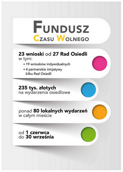 Fundusz Czasu Wolnego pojawił się w tym roku po raz pierwszy – jako propozycja realizacji przez samorządy osiedli dodatkowych działań dla mieszkańców podczas wakacji. Źródłem finansowania inicjatyw są środki z budżetu miasta. Zadania realizowane są przy współpracy z organizacjami społecznymi działającymi na osiedlach, stowarzyszeniami, fundacjami, klubami sportowymi, a także placówkami edukacyjnymi.