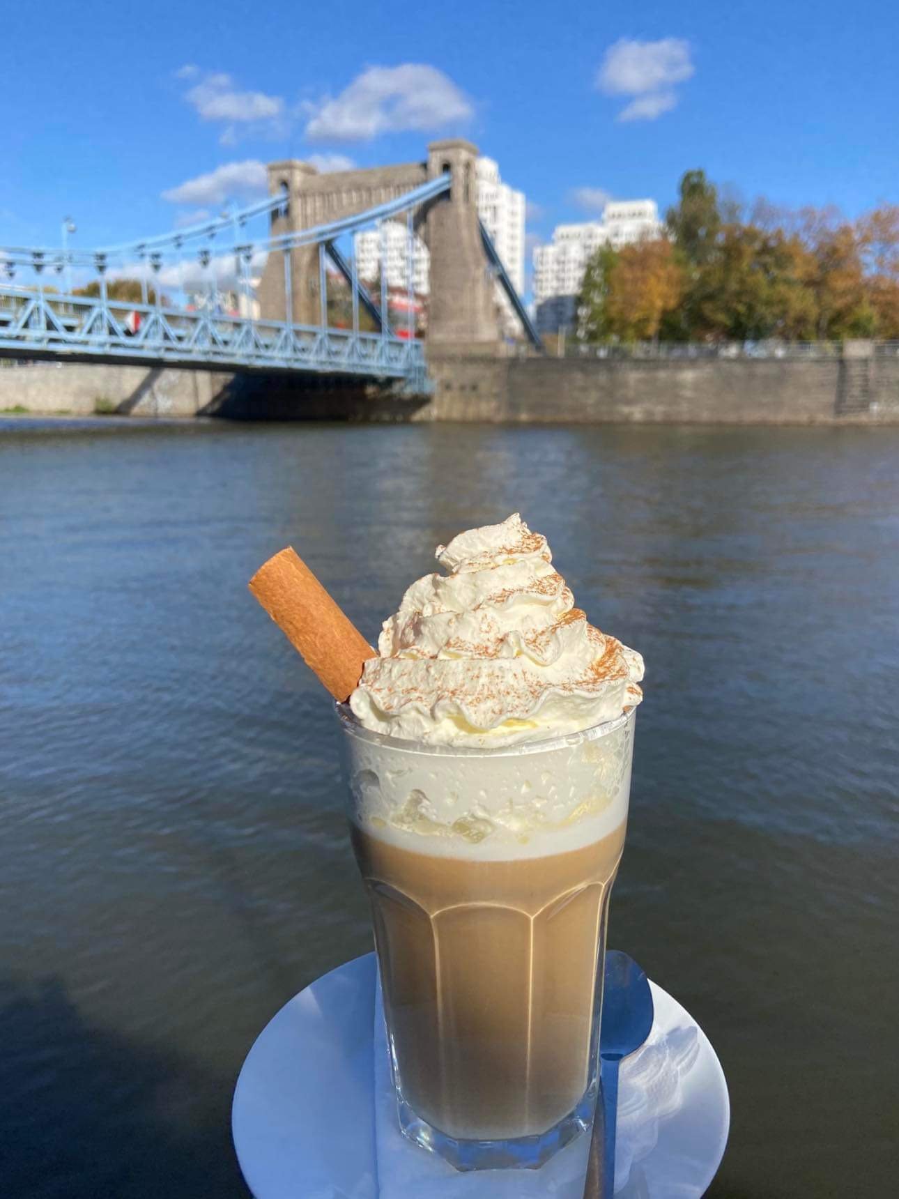 Dyniową latte z pięknym widokiem na rzekę wypijecie w klimatycznej kawiarence w Odra Centrum, tuż przy Moście Grunwaldzkim. W jesiennym menu jest również affogato, czyli kawa z lodami oraz imbirowy shot na odporność.