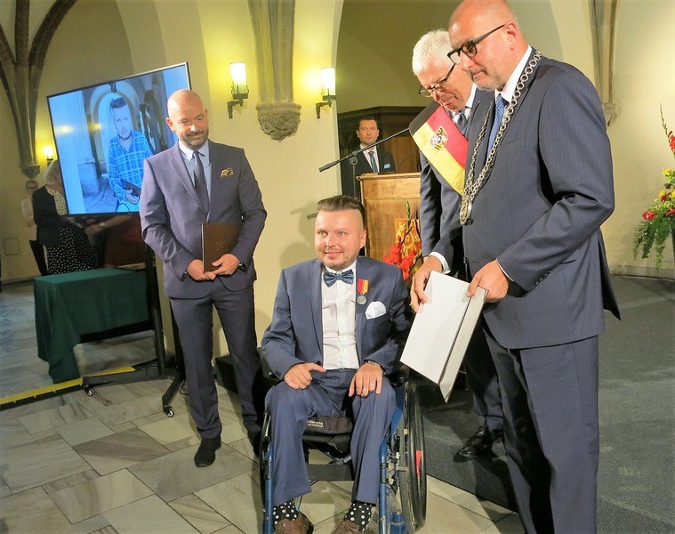 Tomasz Skrzypek z dyplomem. Obok, po lewej, wiceprzewodniczący RM Rafał Czepil, który odczytał laudację na cześć laureata, fot. mawi