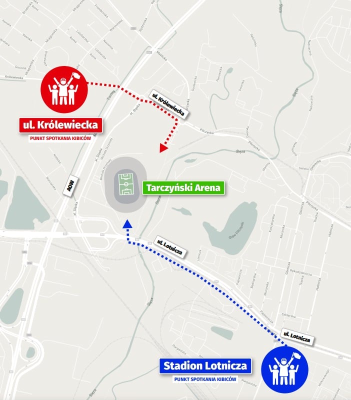 Potrzebujesz pomocy, o coś zapytać? Zgłoś się do osób ubranych w zielone kamizelki z napisem FAN SUPPORT, które będą przy stadionie. Do dyspozycji są także funkcjonariusze mundurowi – policjanci i strażnicy miejscy.