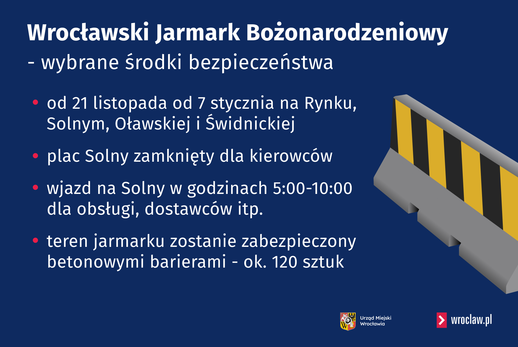 Organizacja tak dużego wydarzenia wiąże się ze szczególnymi środkami bezpieczeństwa. - Teren jarmarku zostanie zabezpieczony betonowymi barierami. Ponad 120 betonowych elementów stanie równolegle do ruchu pieszych wokół całego terenu jarmarku. Wszystkie drogi dojazdowe do Rynku będą zabezpieczone betonowymi zaporami oraz – w wybranych miejscach – specjalnymi zbiornikami wypełnionymi wodą – zapowiedziała wiceprezydent Wrocławia Renata Granowska.
