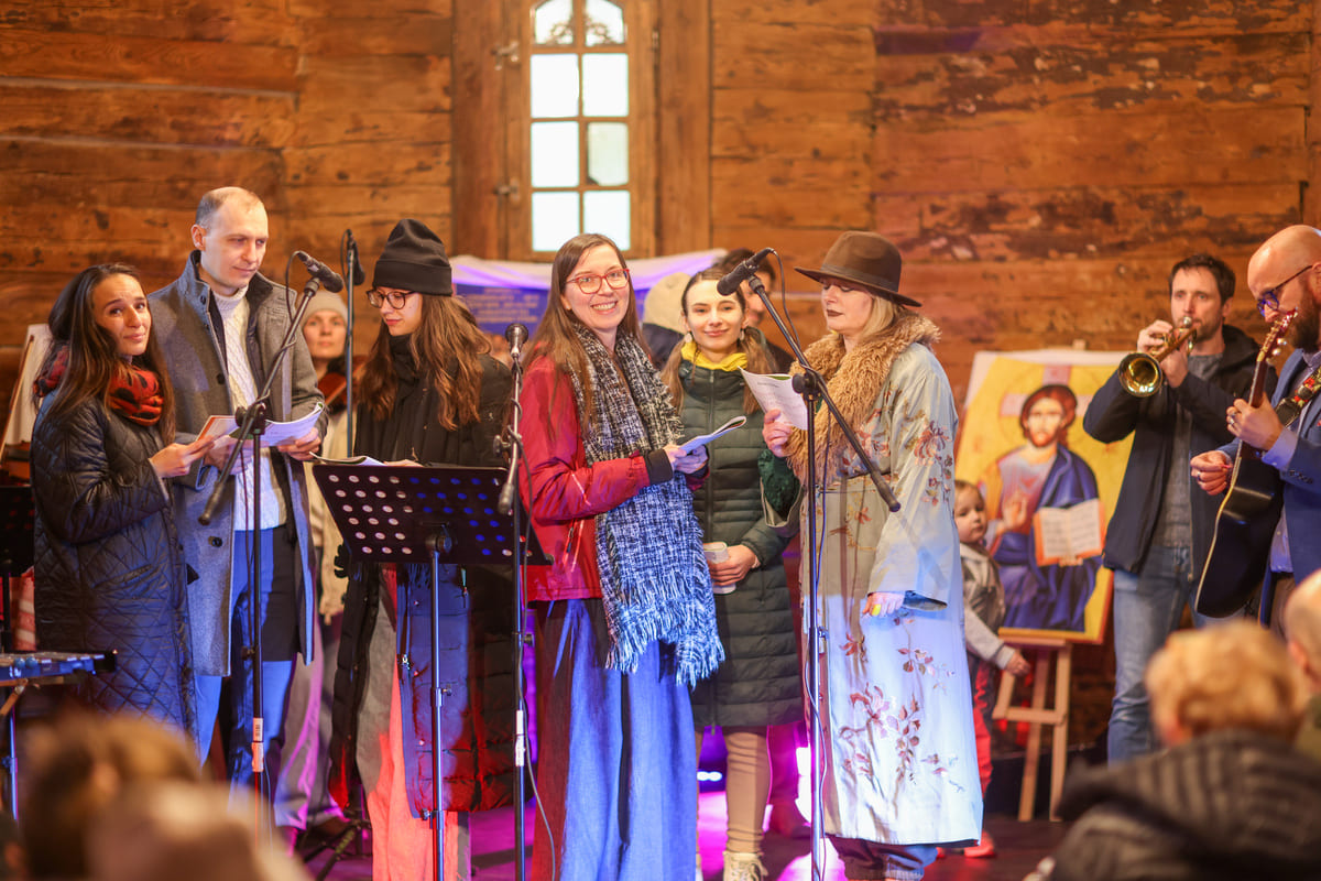Tomasz HołodWspólne kolędowanie w dawnym kościólku św. Jana Nepomucena, stojącym w Parku Szczytnickim. Wrocław, 24.01.2026. Na zdjęciu dwie kobiety i mężczyzna przy mirkofonie.