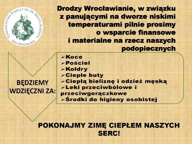 O pomoc prosi również Towarzystwo Pomocy im, św. Brata Alberta. Potrzebne są koce, pościel, kołdry, ciepłe buty, ciepła odzież męska. Przyjmowanie informacji o darach żywnościowych i rzeczowych — tel. 781 996 886 (w godz. 7:30–15:30).
