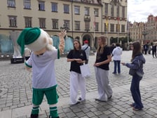 W piątkowe przedpołudnie przechodnie robią zdjęcia z wysoką na przynajmniej 2 metry kopią i maskotką, która rozdaje im tatuaże z krasnalem piłkarzem.