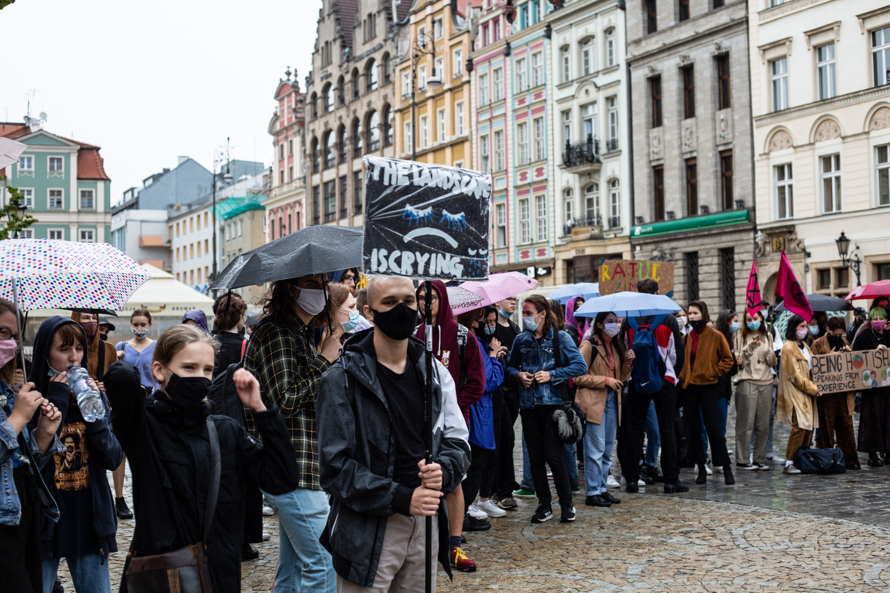 Klimat nie jest obojętny młodym osobom, które spotkały się pod wrocławskim Pręgierzem. Mimo niesprzyjajacej pogody młodzież zaprotestowała przeciwko ignorowaniu ważnych spraw związanych ze zmianami klimatu.