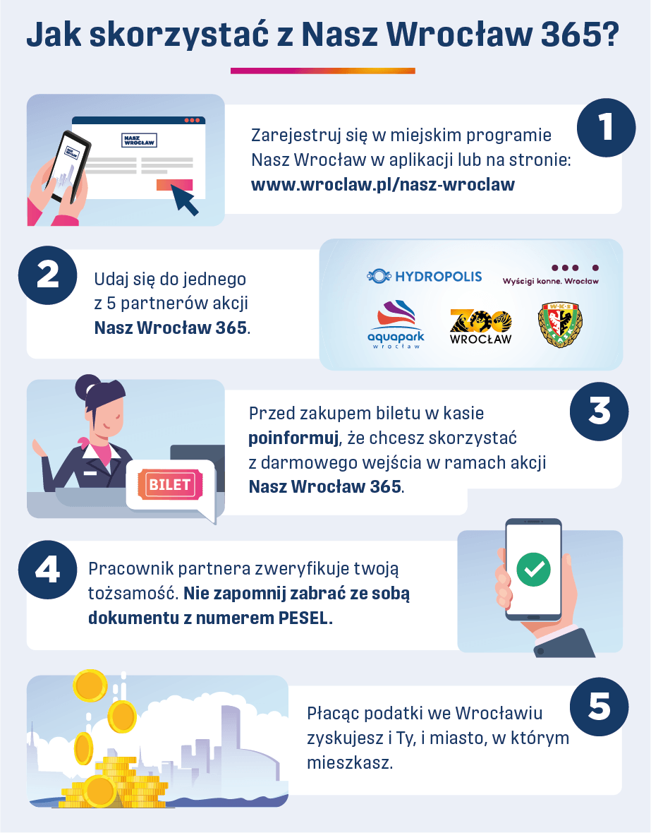 - po przyjściu do jednego z pięciu partnerów akcji poinformować że się chce skorzystać w z darmowego wejścia w ramach akcji Nasz Wrocław 365 i pokazać dokument z numerem PESEL.