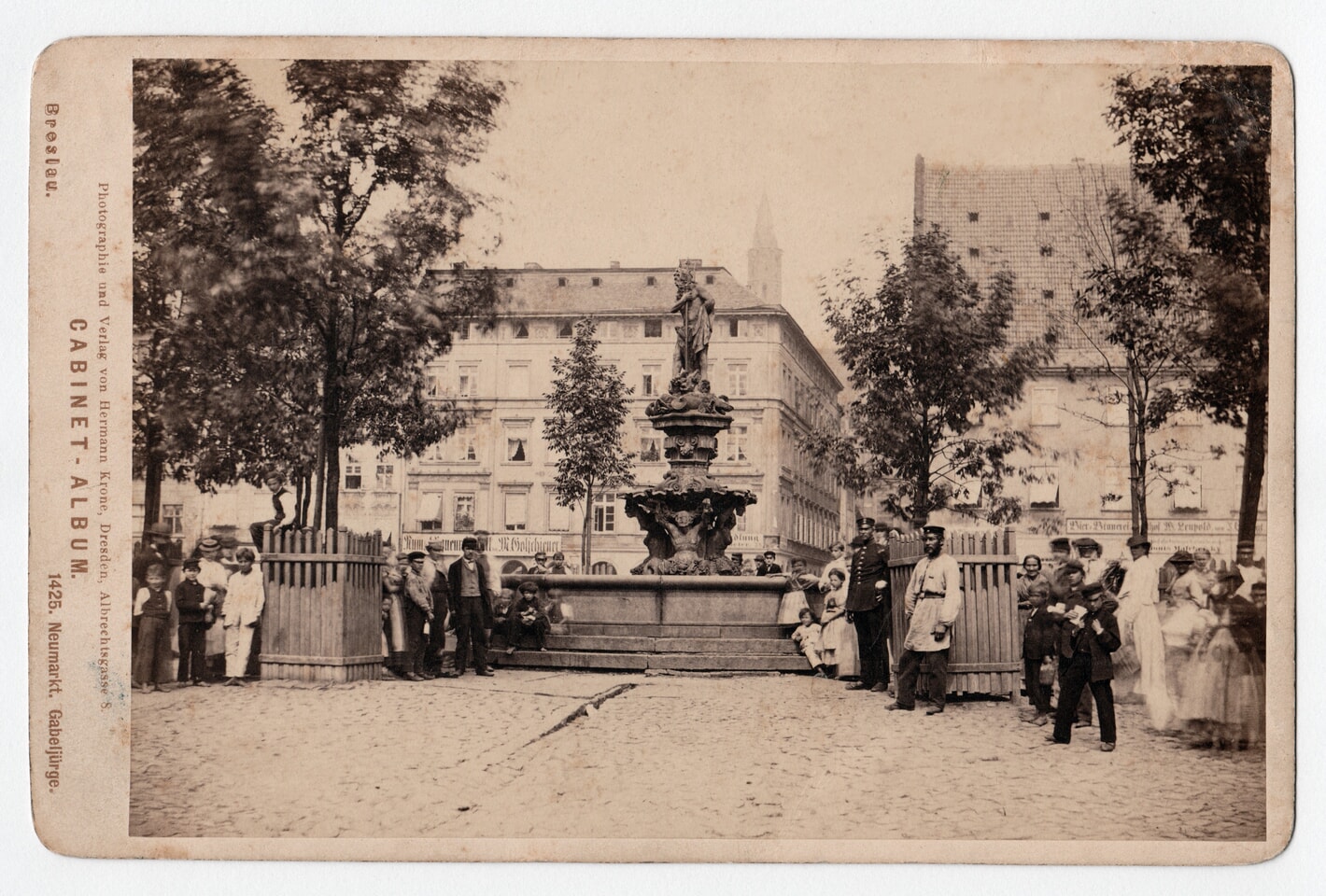 Zdjęcie pochodzi z około 1870 roku, czyli tuż sprzed podmiany rzeźb. Wykonał je Hermann Krone. Ten pochodzący z dawnego Breslau pionier niemieckiej fotografii większość swojego życia zawodowego spędził w Dreźnie i tam też pocztówkę wydano.