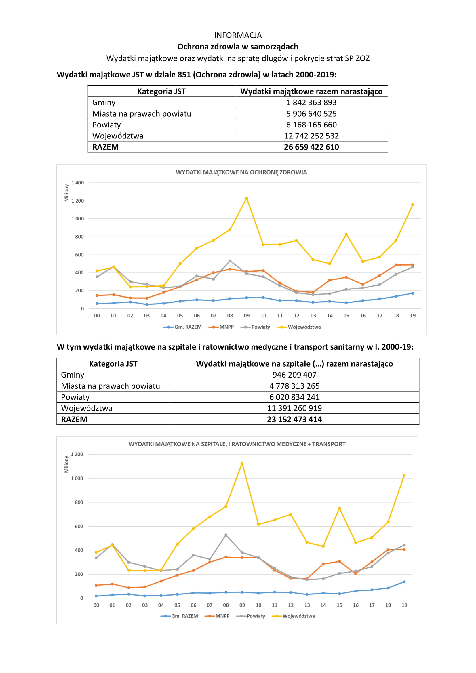 W okresie od 2000 do 2019 roku wydatki samorządów na ochronę zdrowia wyniosły łącznie blisko 26,7 mld zł, z czego na samo doposażenie szpitali, ratownictwa oraz transportu medycznego przeznaczono ponad 23,2 mld zł.