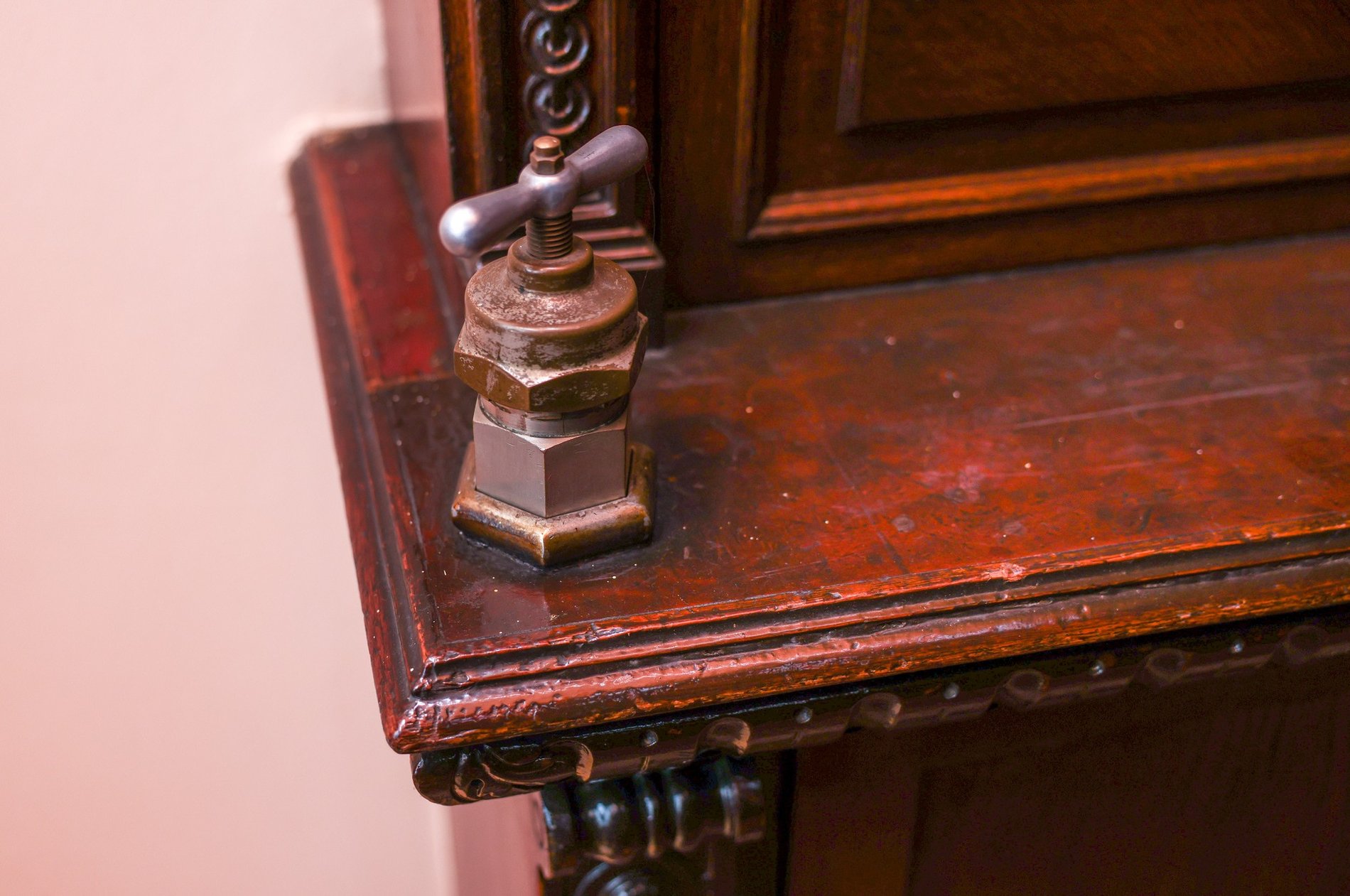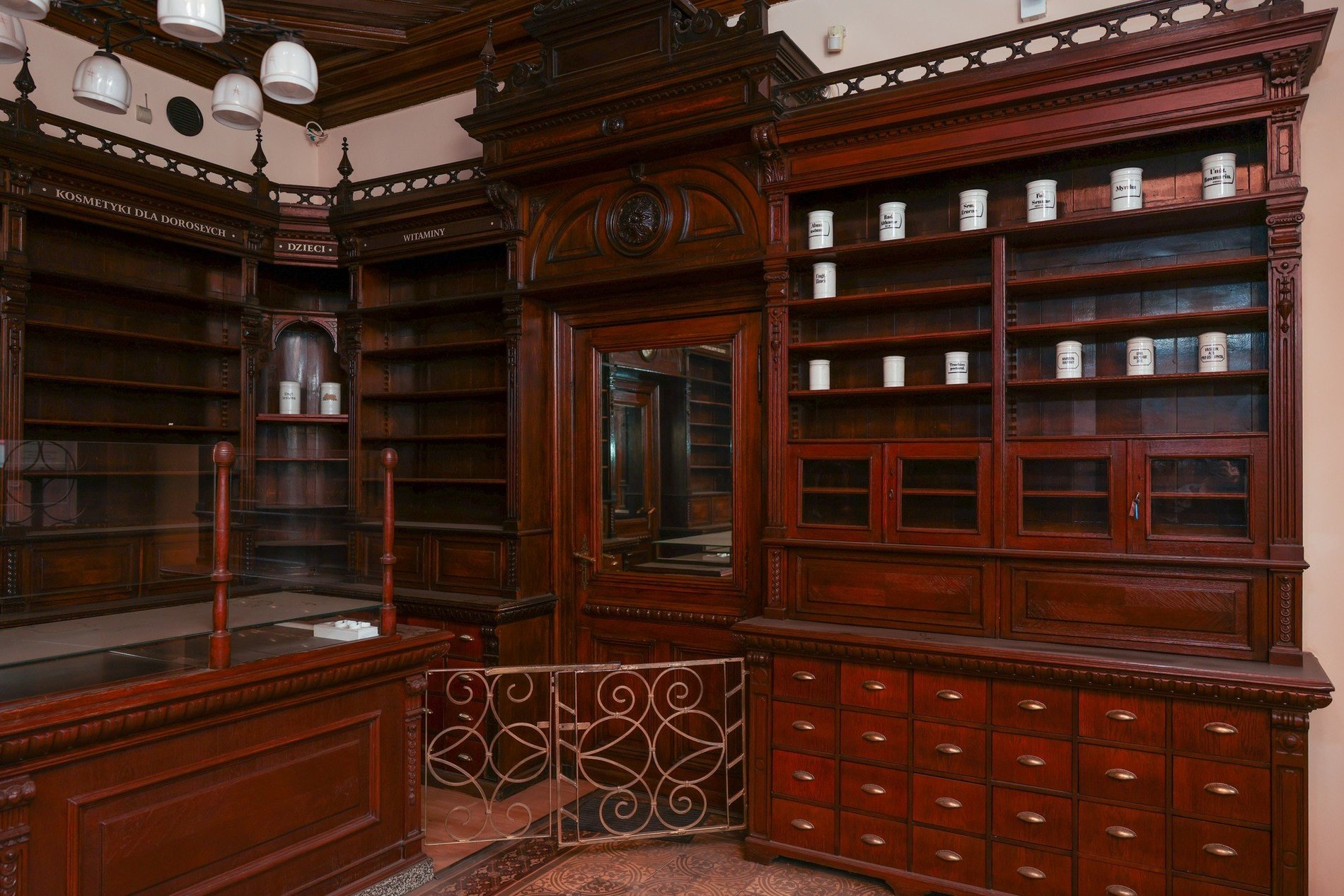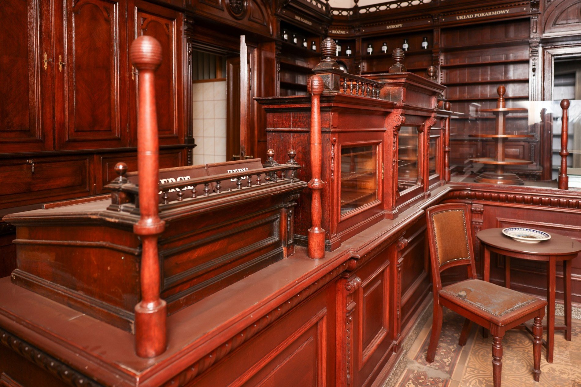 Wewnątrz apteki znajdują się oryginalne, przeszło stuletnie, robione na wymiar meble, wraz z drewnianym sufitem, będące pod opieką konserwatorską. To kunsztownie wykonany wystrój, w którego skład wchodzi nawet wiekowy zegar.