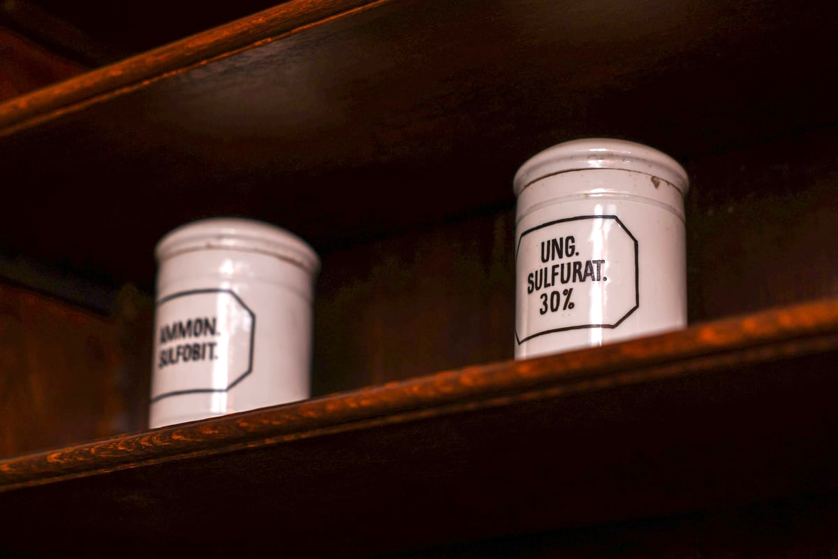 Na półkach dostrzeżemy też słoiki z nazwami substancji chemicznych. – Niektórych współczesna farmacja już nie pamięta – śmieje się pan Andrzej. Właściciel znalazł słoiczki w aptece po jej przejęciu.