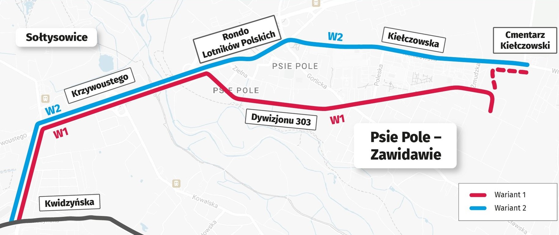 Będzie to wspólne przedsięwzięcie obu gmin, bowiem Wrocław kończy się wraz z ul. Ołtaszyńską, za ulicą gen. Maczka, kolejna boczna droga - ul. Bajeczna - leży już w gminie Kobierzyce. Zaczyna się tu kobierzycka ulica Radosna. I tędy miałby jeździć tramwaj aż do pętli przy Wschodniej Obwodnicy Wrocławia.