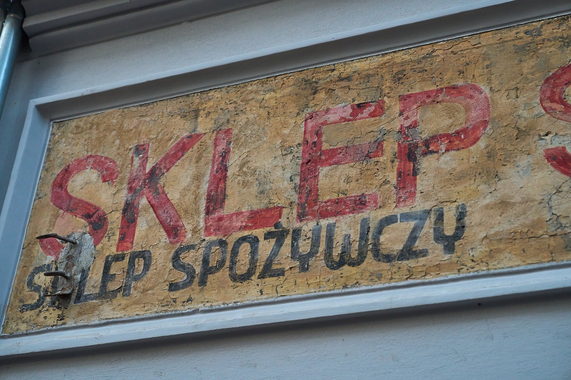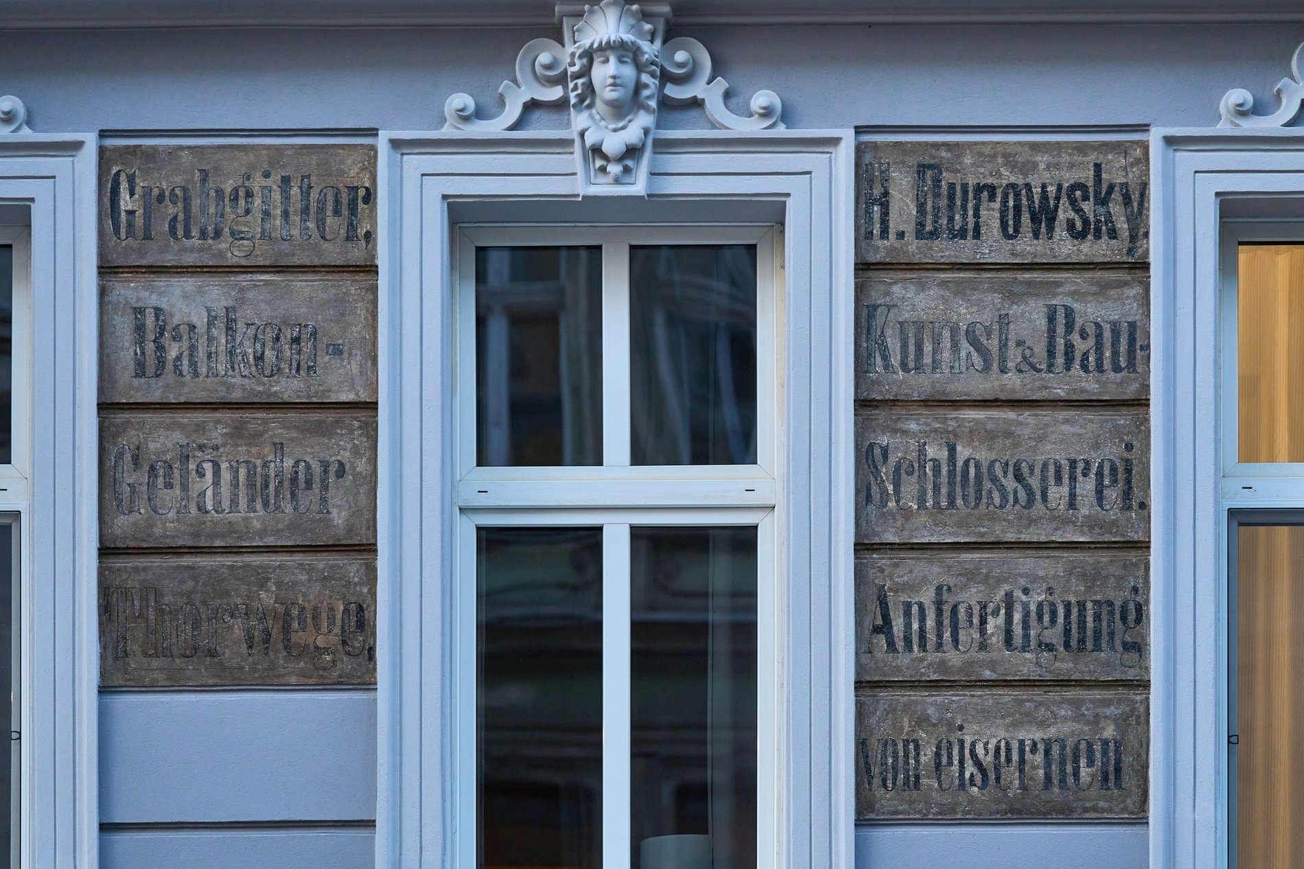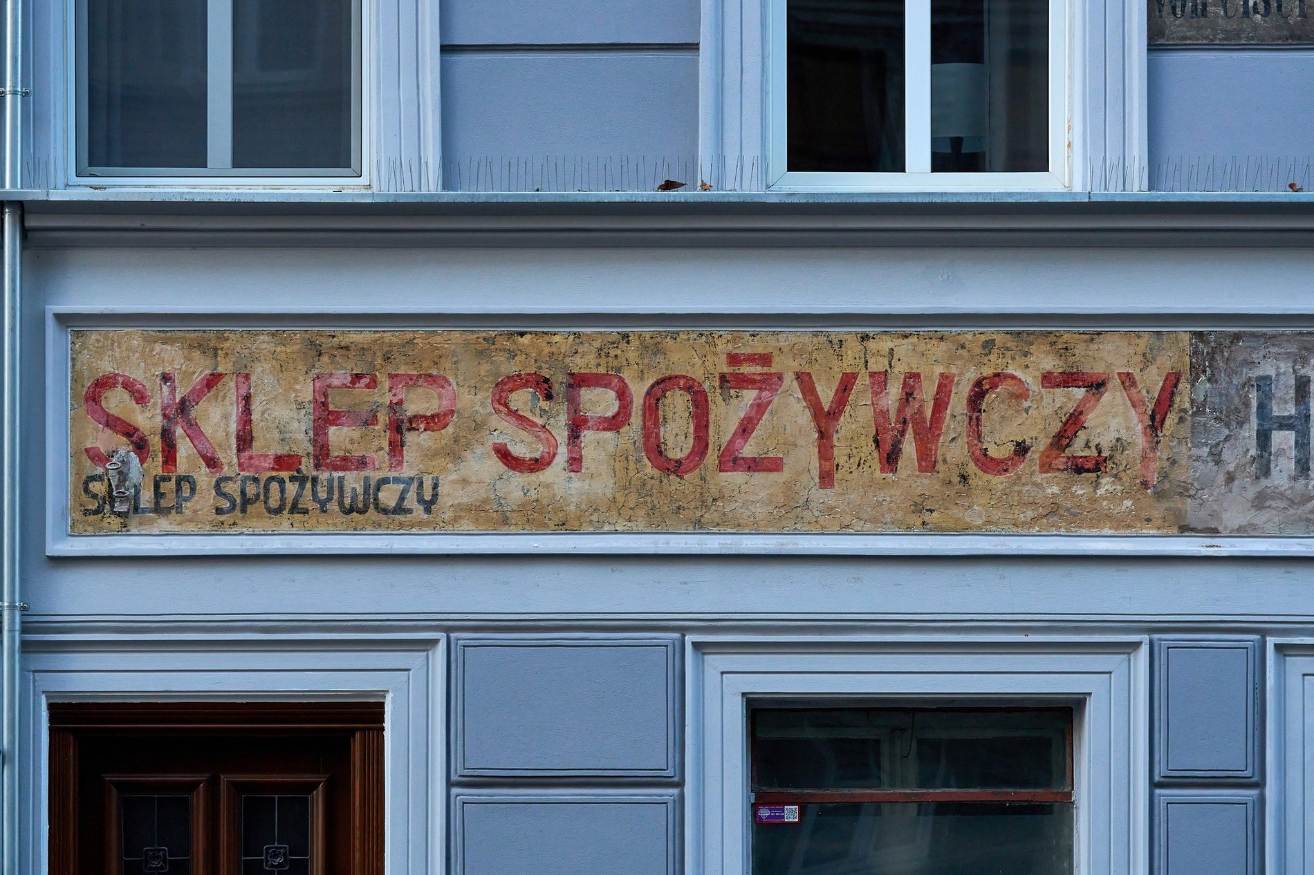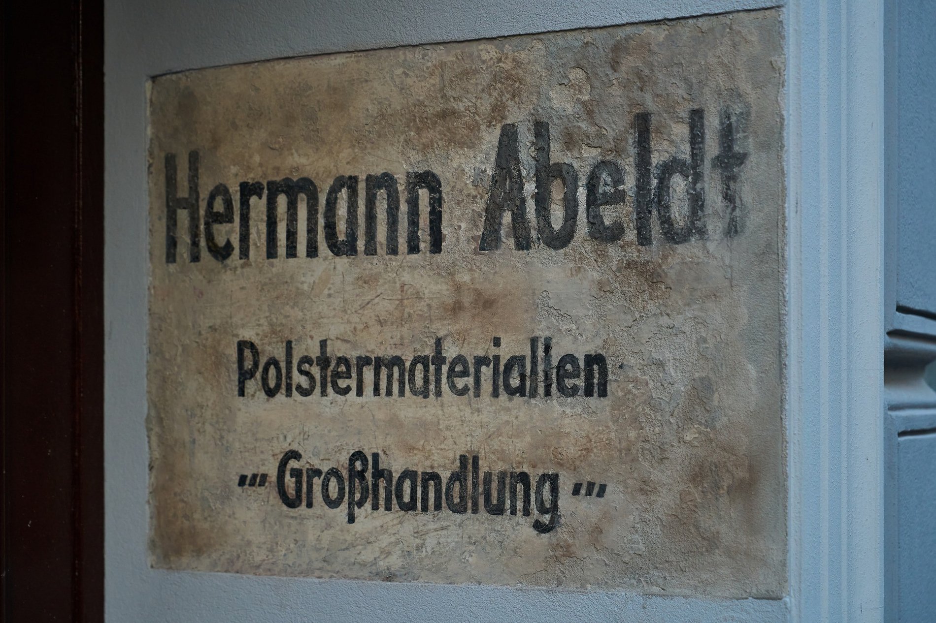 Szyldy pozostały po dawnych przedsiębiorcach, którzy prowadzili biznesy w parterze kamienicy wzniesionej przy ówczesnej Salzstrasse. Polstermateriallen Grosshandlug to hurtownia wyrobów tapicerskich i rymarskich Hermana Abeldta, Schlosserei to zakład ślusarski, Kunst & Bau odnosi się do sztuki i budownictwa, jest nazwisko H. Durowsky, jest polski szyld sklepu spożywczego itd.