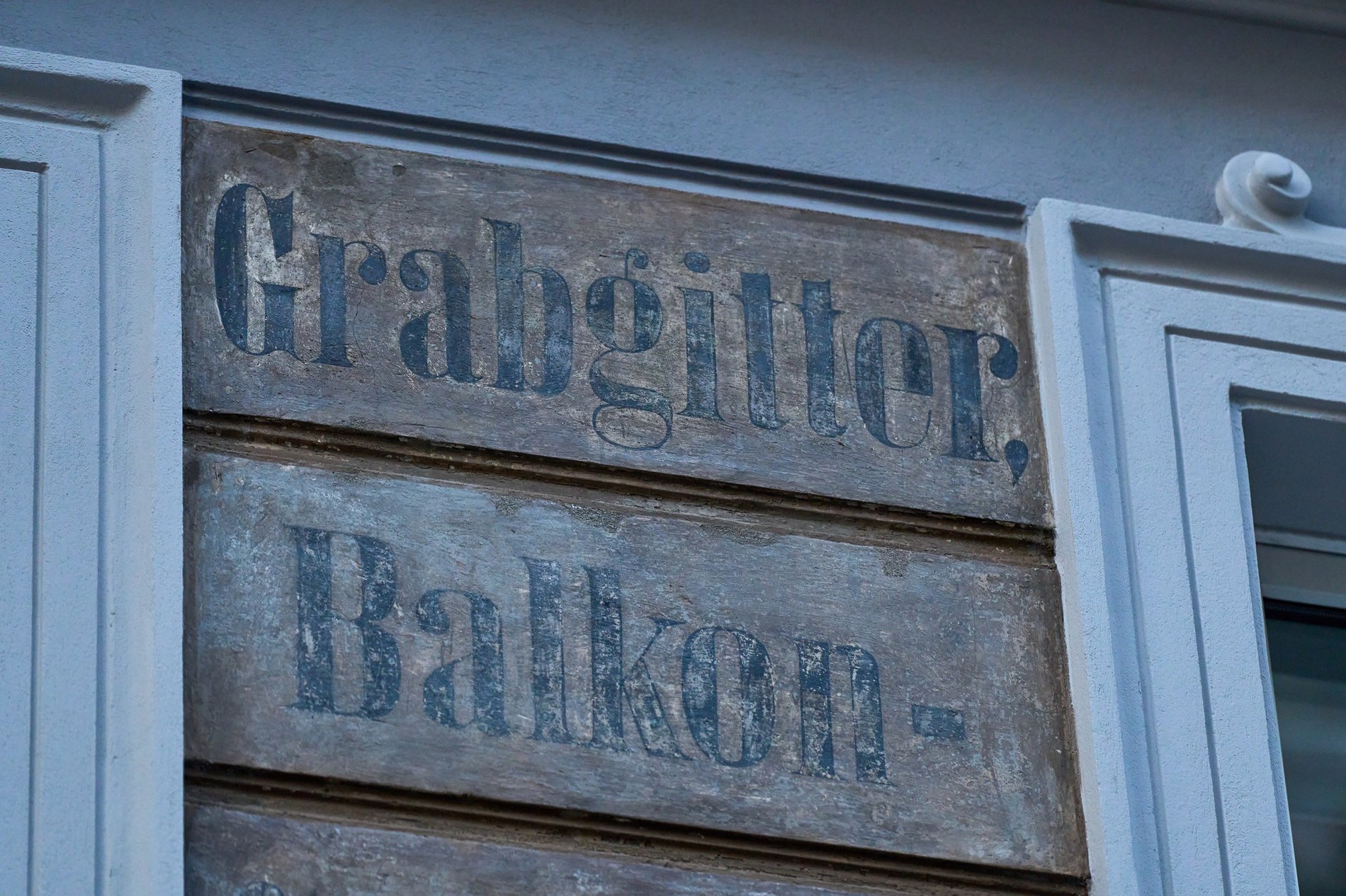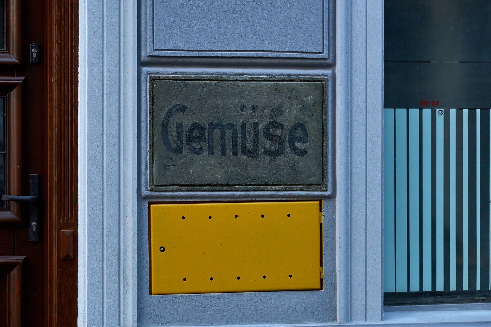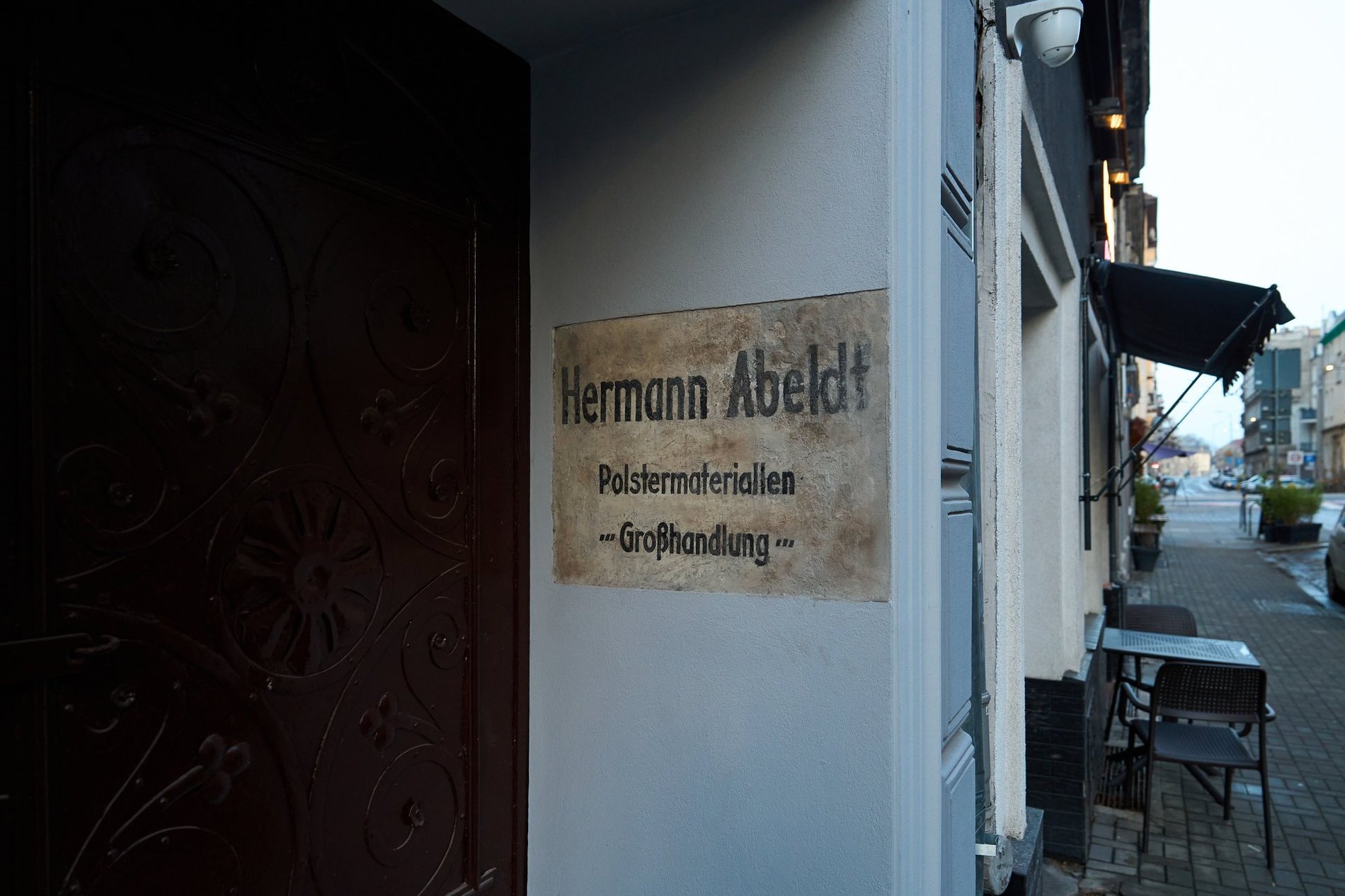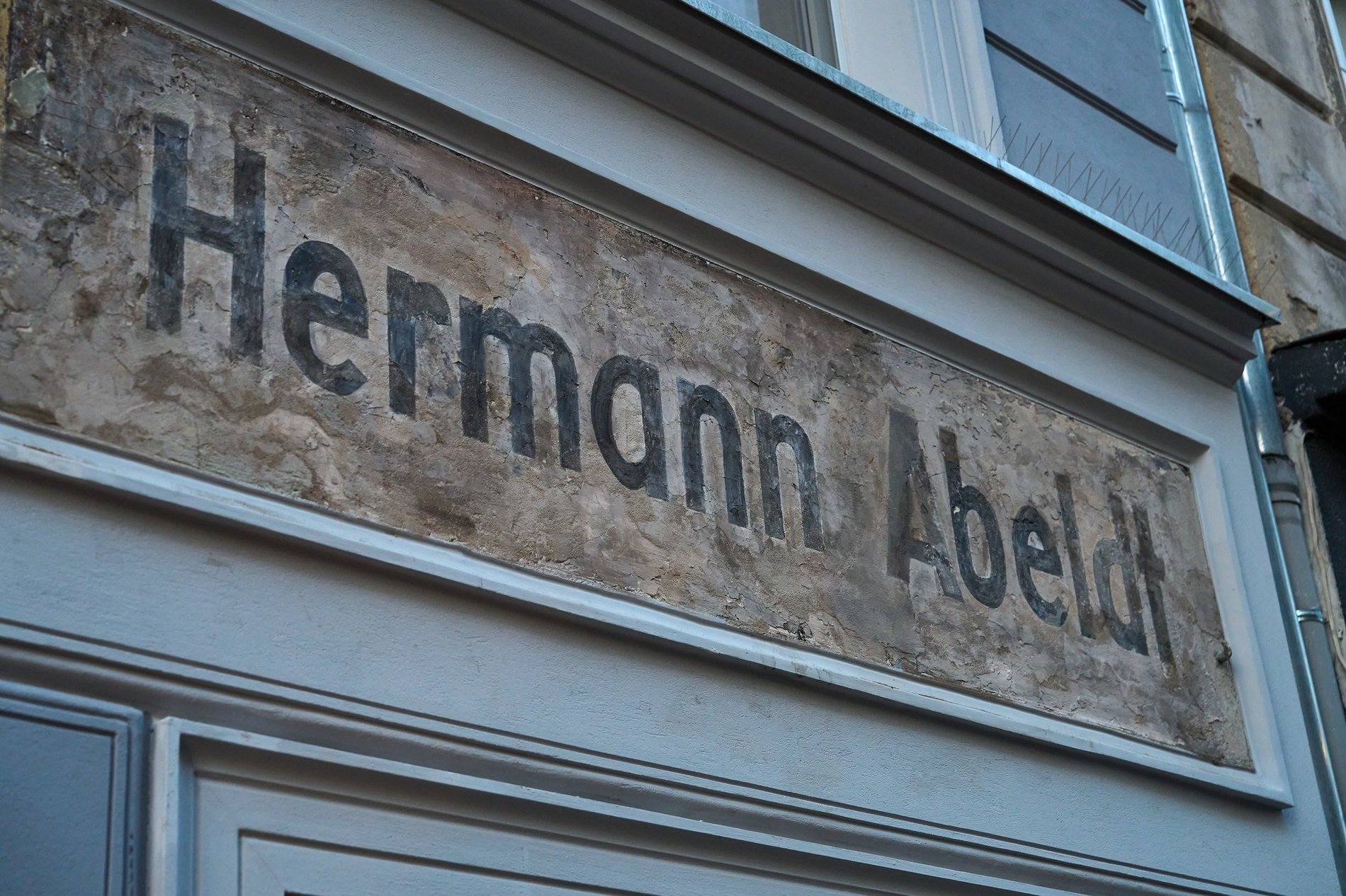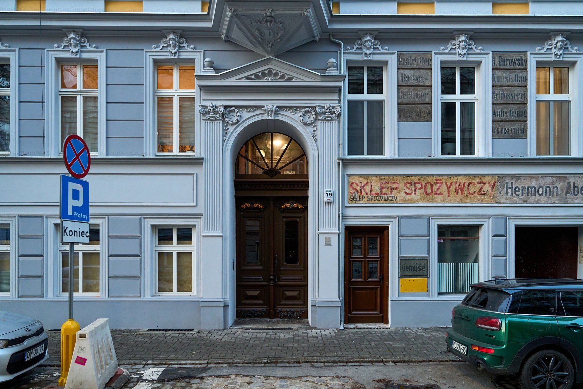 Szyldy pozostały po dawnych przedsiębiorcach, którzy prowadzili biznesy w parterze kamienicy wzniesionej przy ówczesnej Salzstrasse. Polstermateriallen Grosshandlug to hurtownia wyrobów tapicerskich i rymarskich Hermana Abeldta, Schlosserei to zakład ślusarski, Kunst & Bau odnosi się do sztuki i budownictwa, jest nazwisko H. Durowsky, jest polski szyld sklepu spożywczego itd.