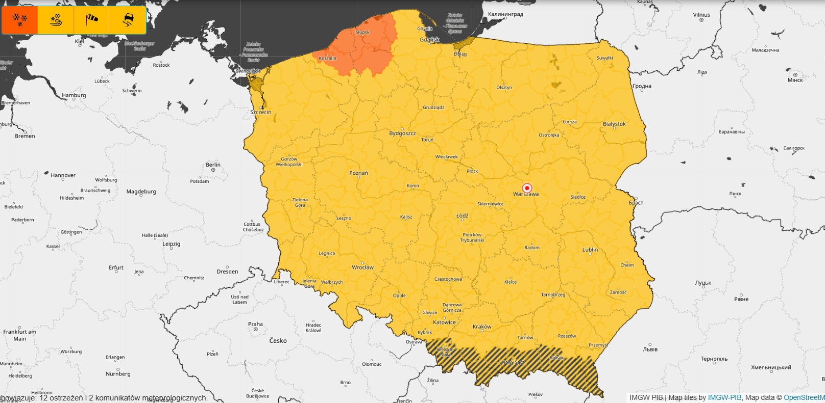 - Przebieg: Miejscami wilgotne i mokre nawierzchnie dróg i chodników po opadach deszczu ze śniegiem i mokrego śniegu będą ulegać zamarzaniu i oblodzeniu. Temperatura minimalna od -4°C do -1°C, przy gruncie od -6°C do -3°C. Miejscami ujemna temperatura powietrza utrzyma się również w ciągu dnia 03.01.