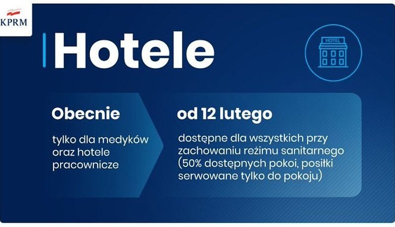 - Hotele – dostępne dla wszystkich przy zachowaniu reżimu sanitarnego (50 proc. dostępnych pokoi, posiłki serwowane tylko do pokoi, na życzenie gości. Restauracje hotelowe – zamknięte).