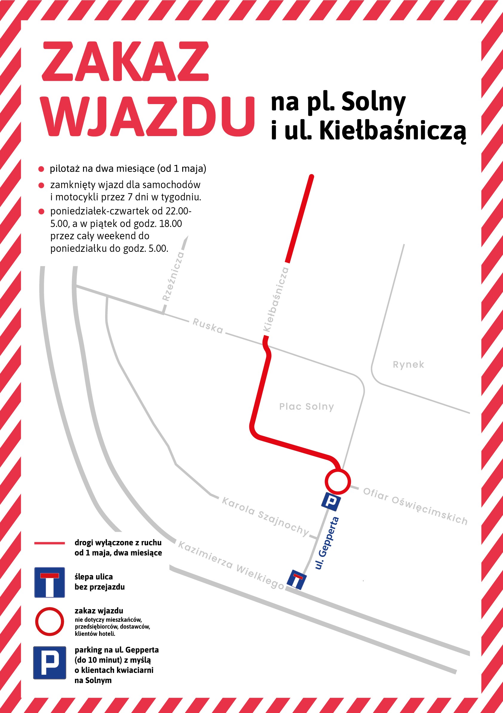 Możliwość wjazdu na Plac Solny i ul. Kiełbaśniczą będą mieli mieszkańcy tego obszaru, osoby prowadzące działalność gospodarczą, restauratorzy, hotelarze i klienci hoteli. Wjazd będzie możliwy na zasadach podobnych jak podczas działania Jarmarku Bożonarodzeniowego.
