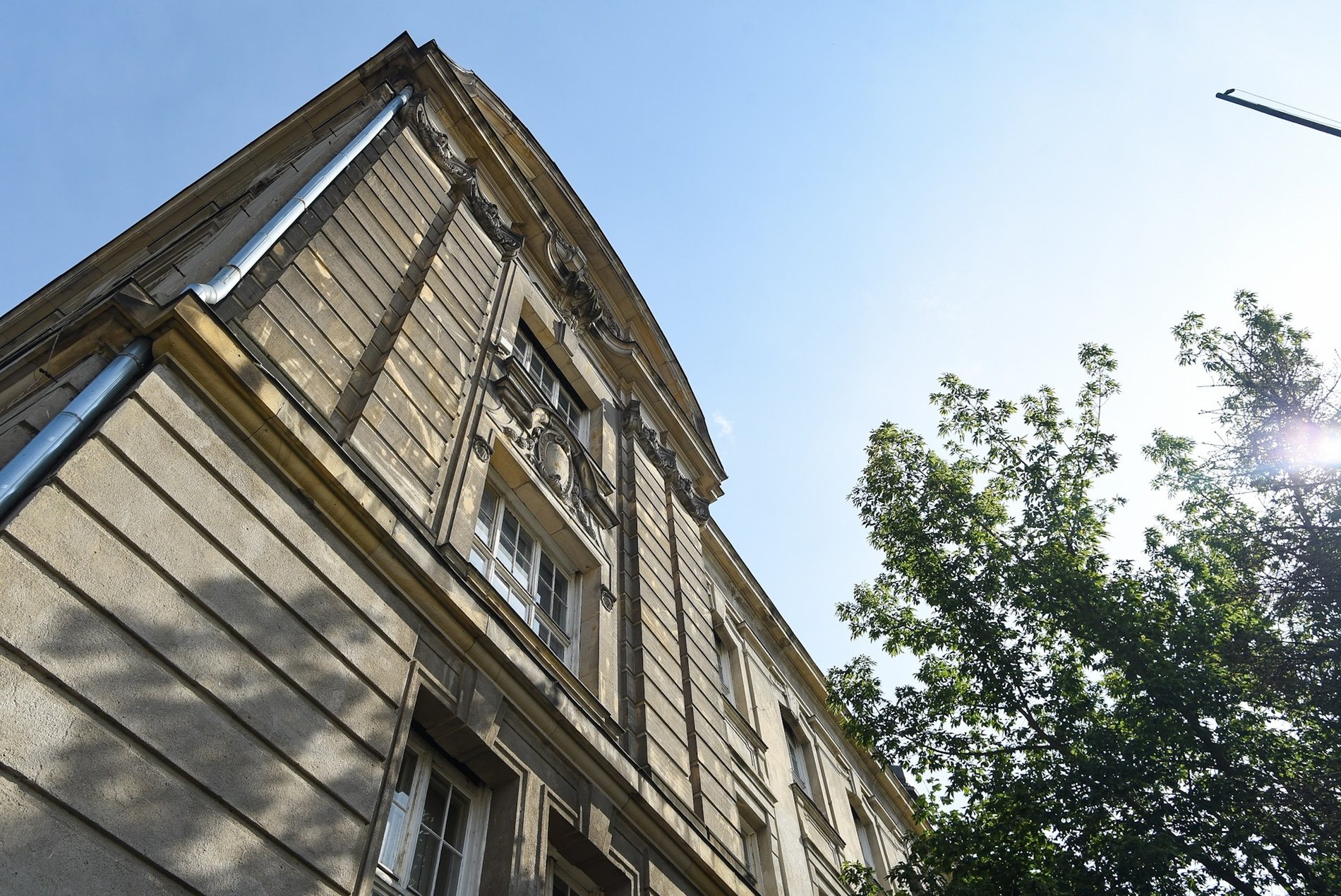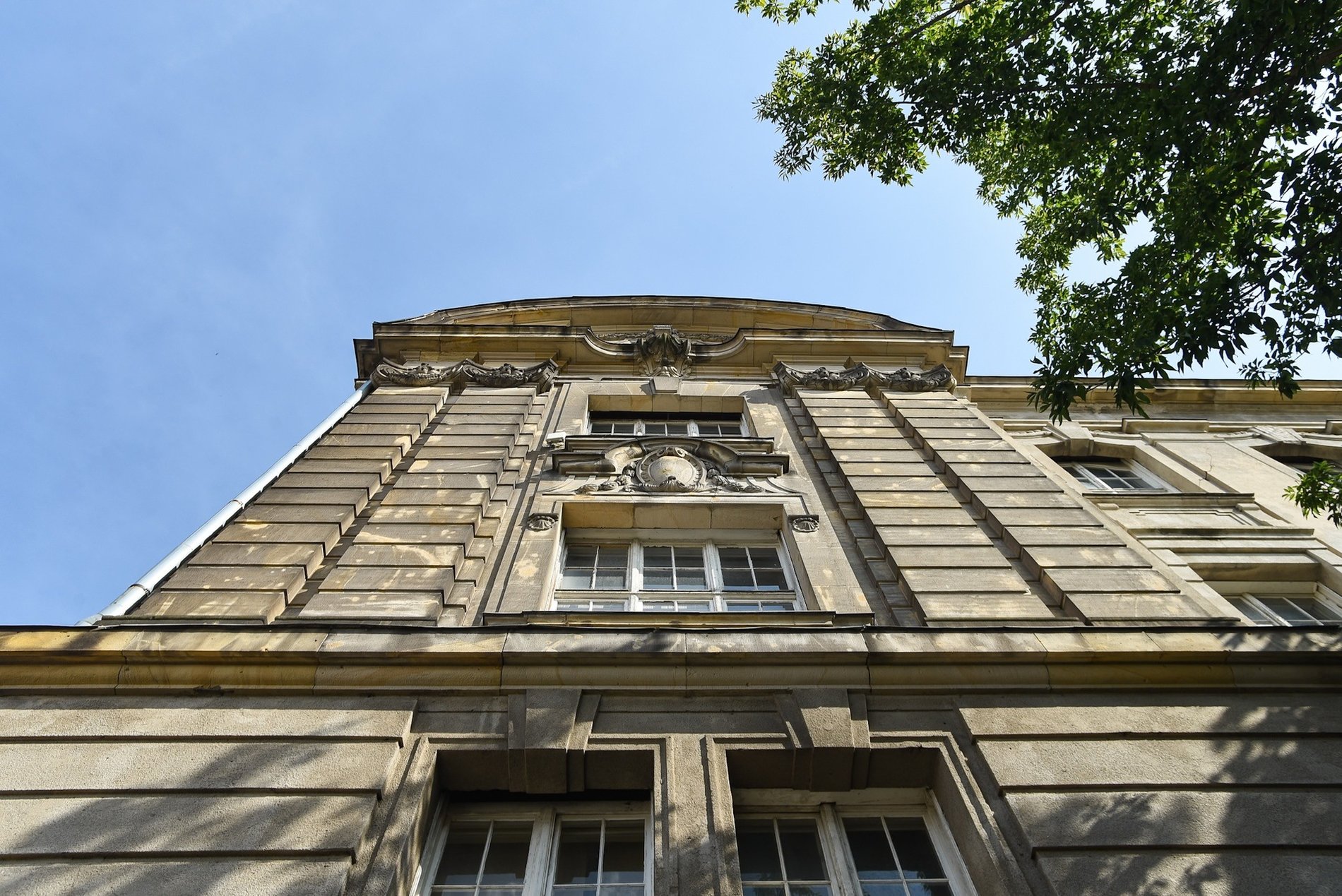 Trzykondygnacyjny i czteroskrzydłowy gmach z sutereną i trzema dziedzińcami został wzniesiony na planie prostokąta i nakryty dachem mansardowym z lukarnami. Tynkowane i licowane piaskowcem elewacje, z boniowaniem na poziomie parteru, bogato ozdobiono detalem architektonicznym.