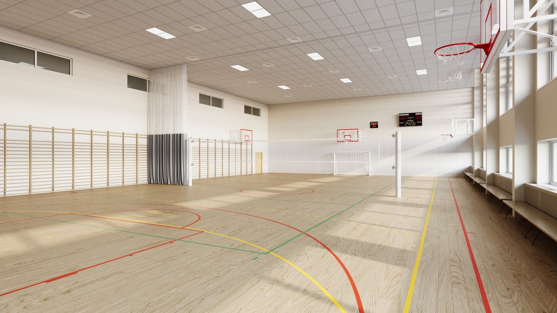 Do dyspozycji uczniów będzie duża sala gimnastyczna z funkcjonalnymi boiskami do koszykówki, siatkówki i piłki ręcznej oraz kotarą dzielącą przestrzeń na dwie części. Oprócz tego, na parterze przewidziano: