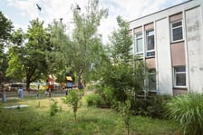 Przedszkole na Oporowskiej plany ma bardziej śmiałe. Mural na elewacji będzie dokończony - pojawi się tam las, najpewniej ze środków własnych, bo to dekoracja. Ale w części ogrodu, gdzie jest tylko trawa - zaplanowano ścieżkę przyrodniczą.