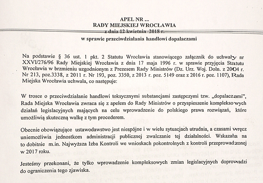 Walka z tzw. dopalaczami była tematem Sesji Rady Miejskiej Wrocławia zwołanej w trybie nadzwyczajnym. Dyskusję poprzedziły rzeczowe wystąpienia służb zajmujących się walką z handlem toksycznymi substancjami zastępującymi narkotyki. W Sali Sesyjnej pojawili się m.in. przedstawiciele policji, prokuratury, Państwowej Inspecji Sanitarnej, NIK, Straży Miejskiej. Po długiej dyskusji, ostatecznie radni miejscy większością głosów zdecydowali o wystosowaniu apelu do Rady Ministrów o kompleksowe zmiany w polskim prawie i przyspieszenie prac zespołu powołanego przez rząd, który zajmuje się tym zagadnieniem.