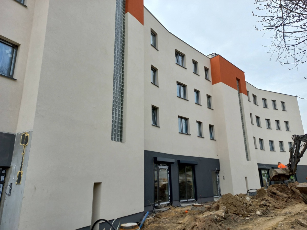 Nowy budynek przy ul. Dolnobrzeskiej 34 osiągnął już stan surowy zamknięty. Wykonano elewację, tynki oraz instalacje wewnętrzne. W sąsiednim, modernizowanym obiekcie zakończono natomiast budowę nowego dachu i stropu. Trwają tam prace elewacyjne oraz montaż niezbędnych instalacji.