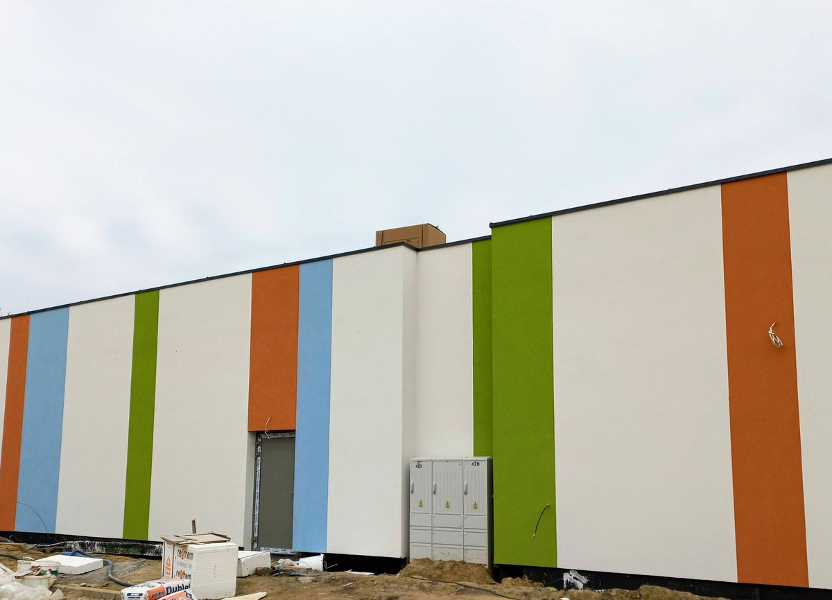 W ramach zadania realizowany jest również budynek przeznaczony na potrzeby świetlicy środowiskowej. Obiekt ma już ukończoną elewację oraz wykonane instalacje. Obecnie prowadzone są prace przy montażu podwieszanych sufitów oraz urządzaniu otoczenia budynku.
