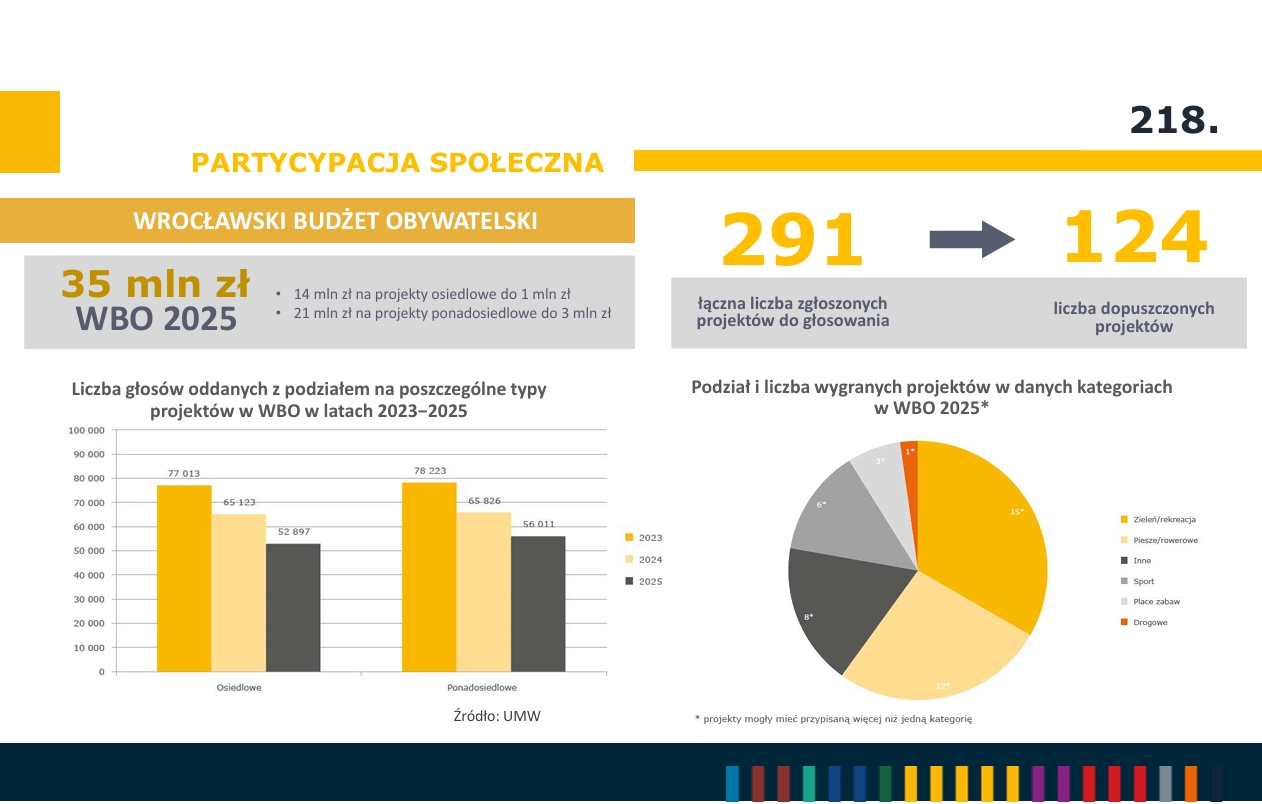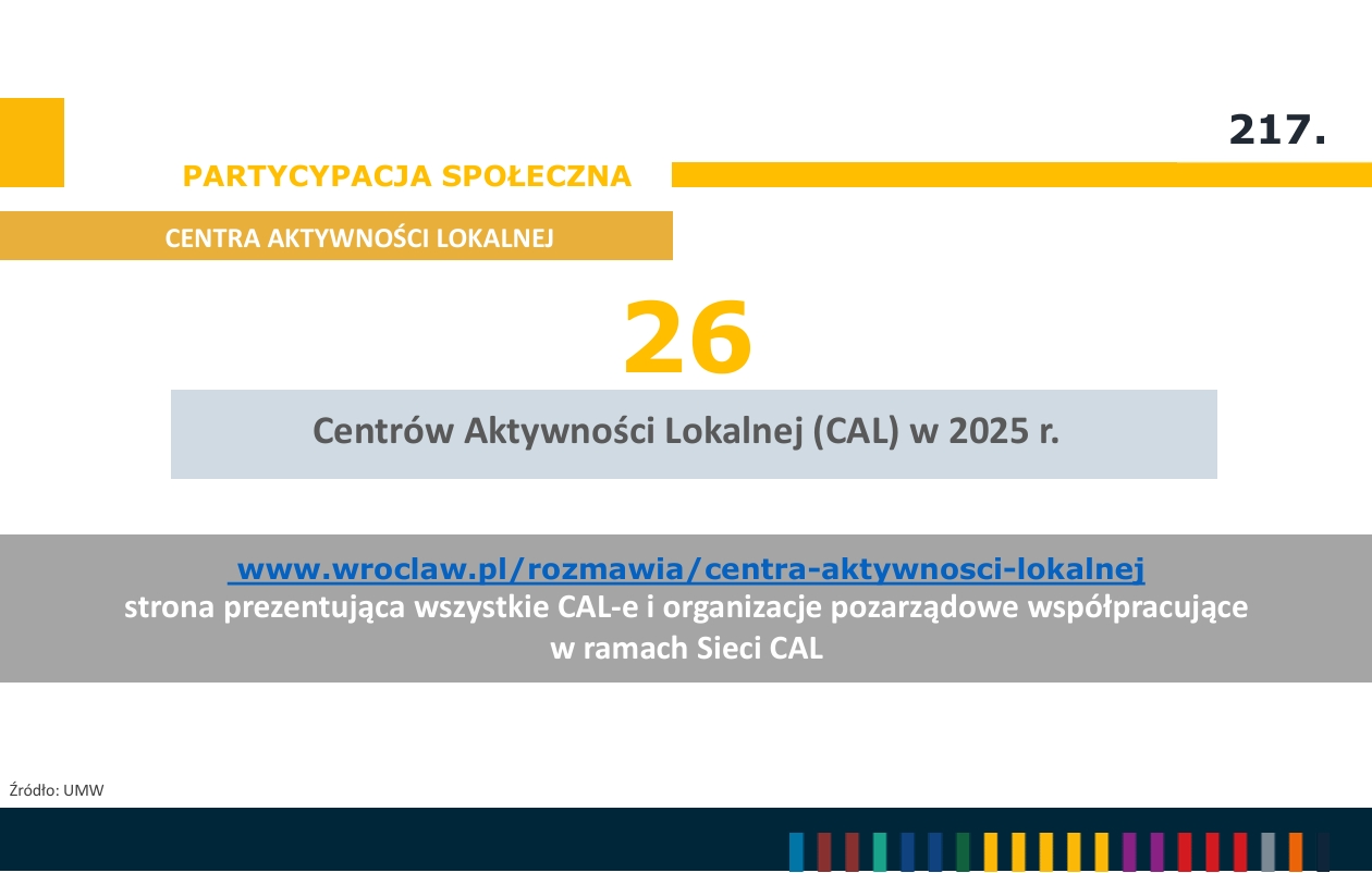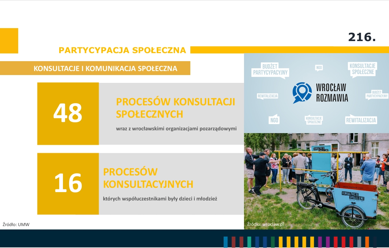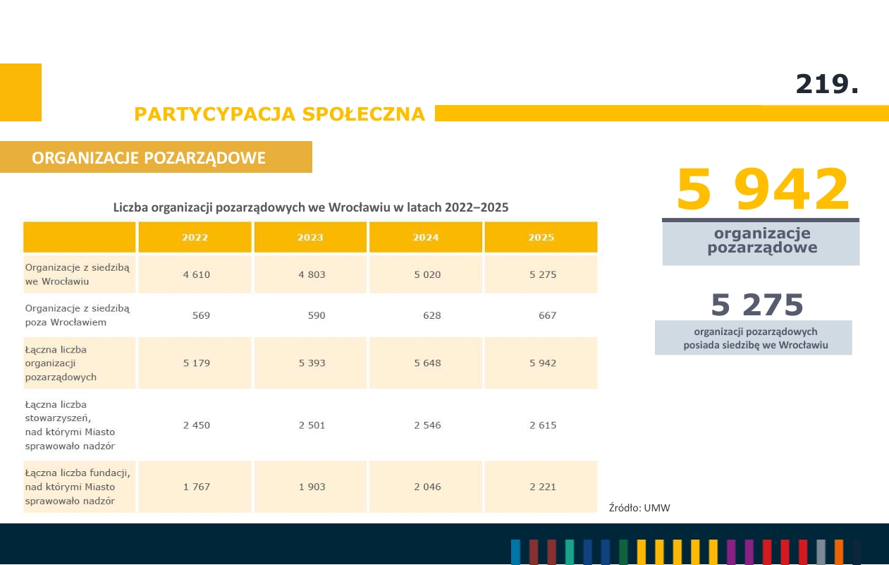 W 2025 roku siedzibę we Wrocławiu miało 5 275 organizacji pozarządowych (NGO). Miasto przeprowadziło także 48 procesów konsultacji społecznych. Liczba Centrów Aktywności Lokalnej (CAL) na wrocławskich osiedlach wzrosła do 26.