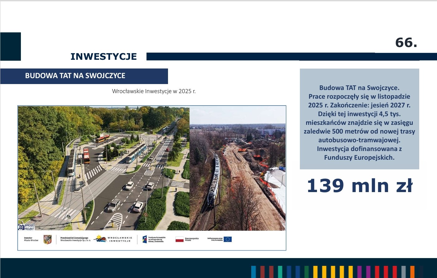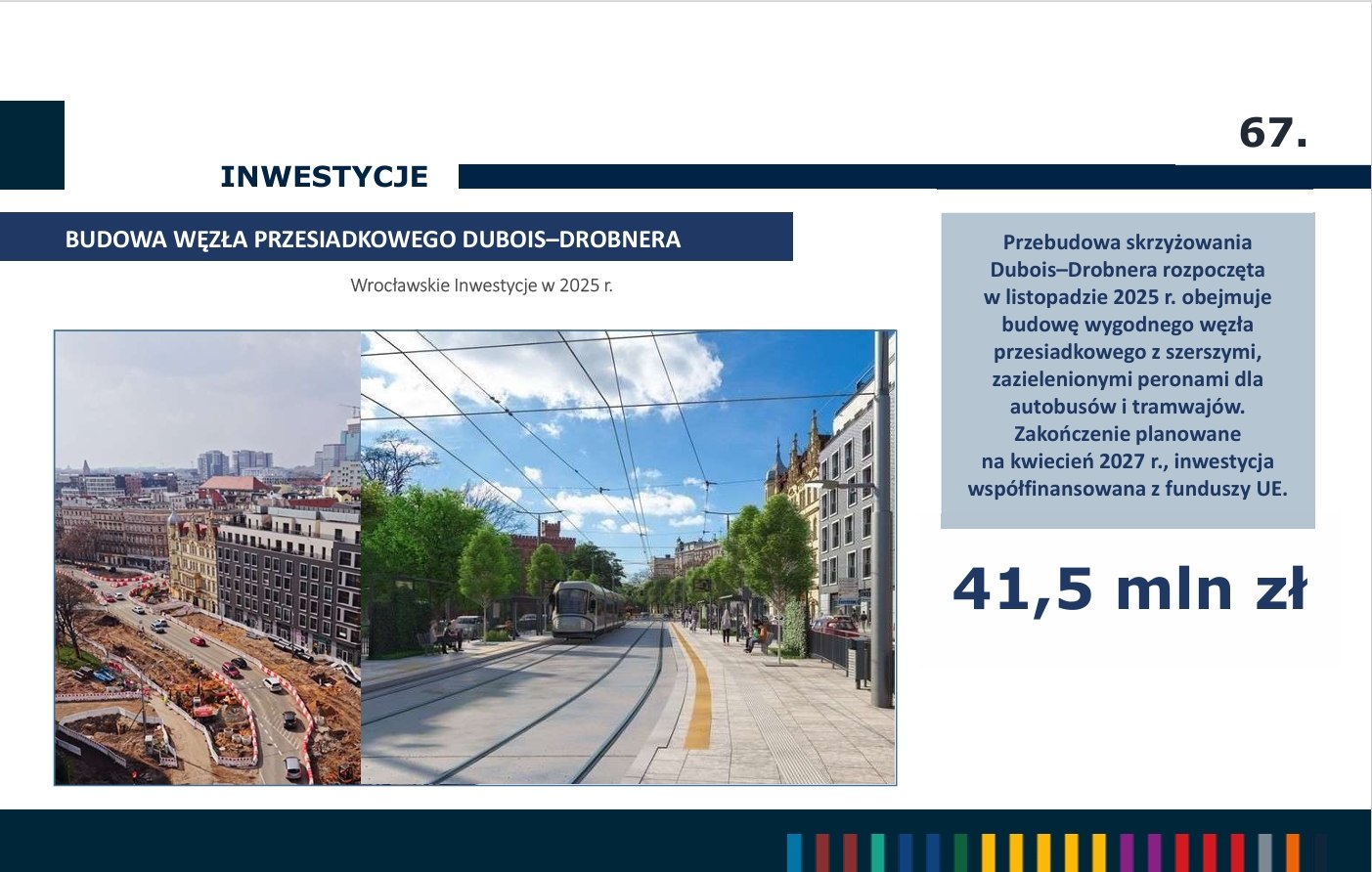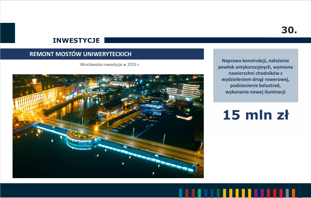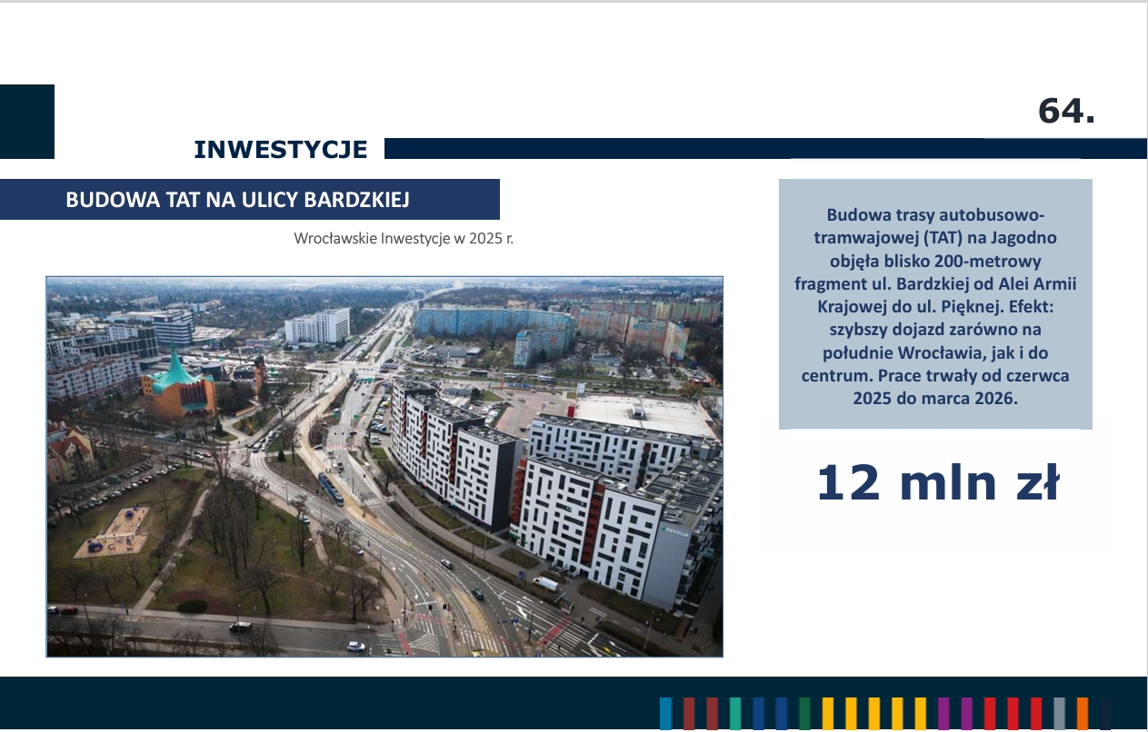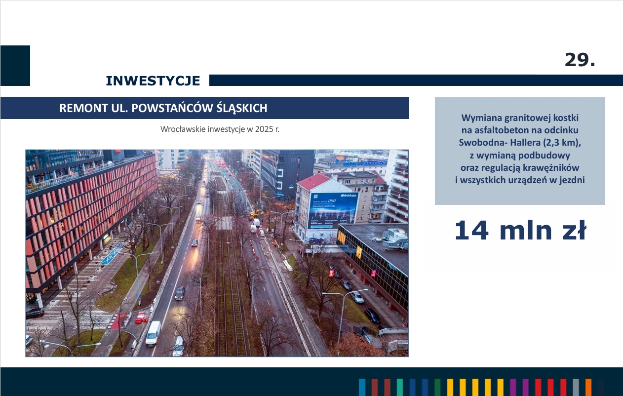 Wśród kilkuset inwestycji realizowanych w tym roku do największych zaliczyć można m.in. budowę TAT na Swojczyce, budowę węzła przesiadkowego Dubois-Drobnera, remont ul. Powstańców Śląskich, remont Mostów Uniwersyteckich oraz budowę TAT na ul. Bardzkiej.