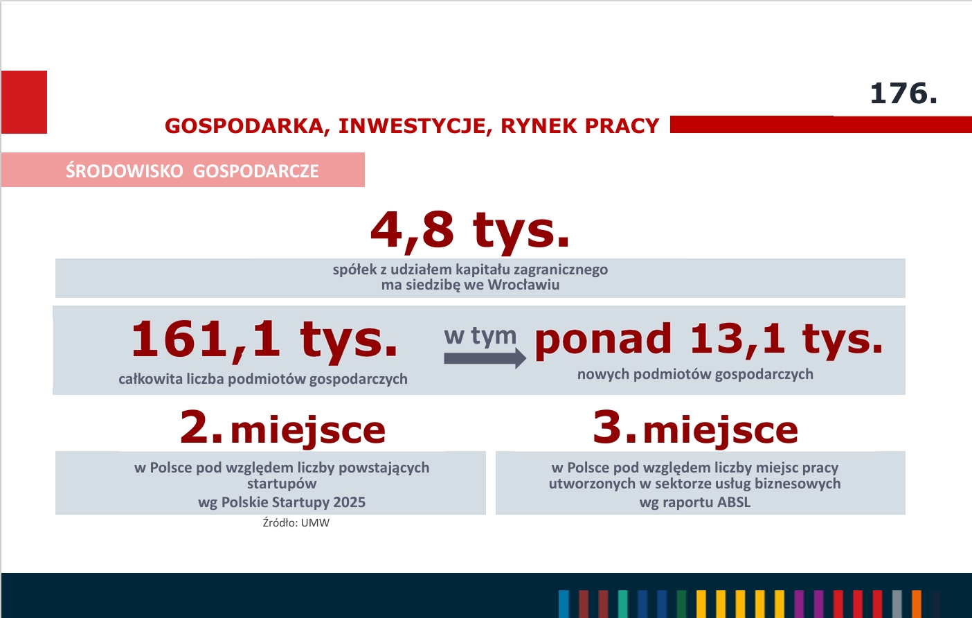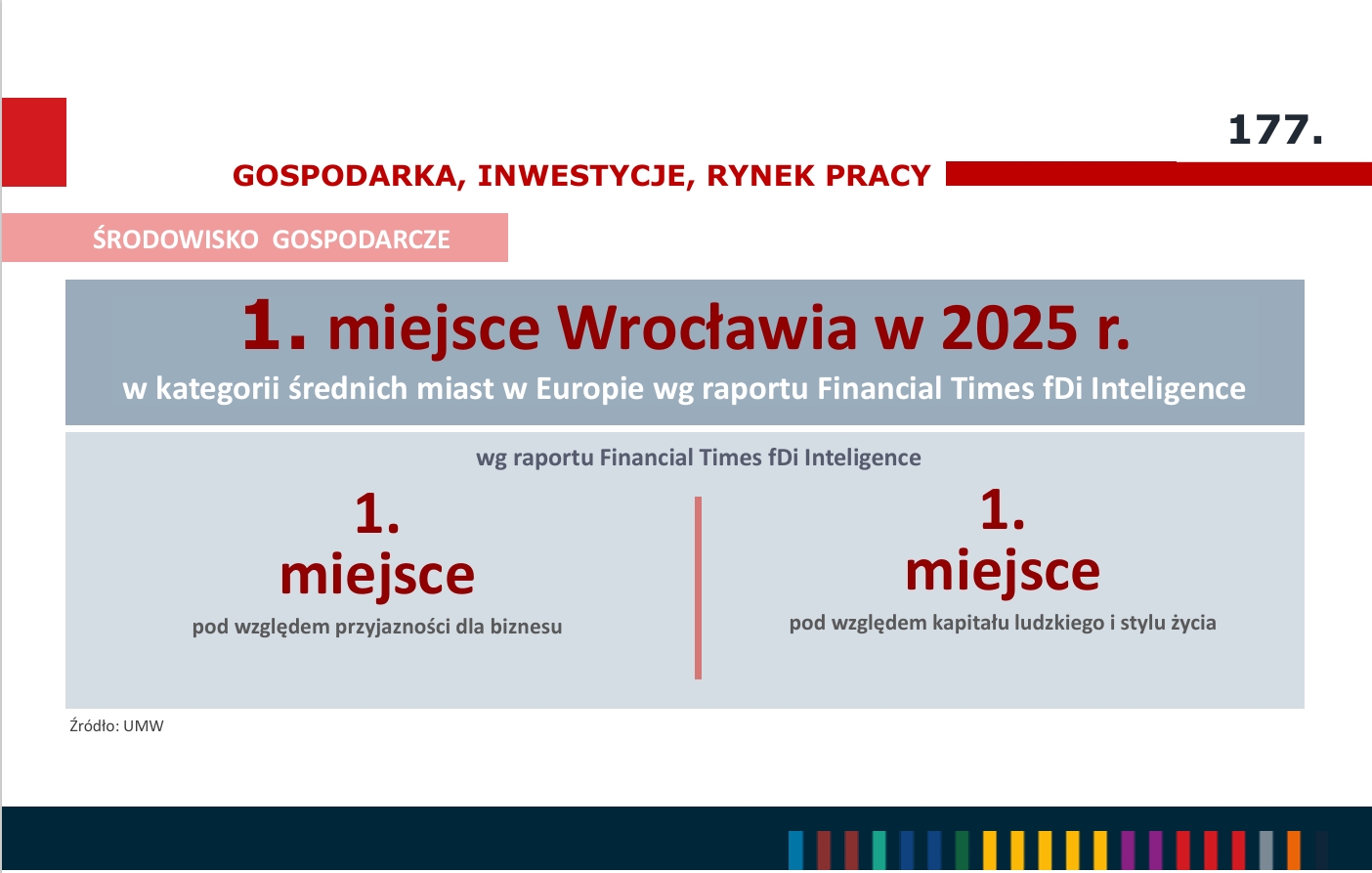 Według raportu Financial Times fDi Inteligence, Wrocław zajął w 2025 roku pierwsze miejsce w kategorii średnich miast. Najwyższe oceny zebrał zarówno pod względem przyjazności dla biznesu, jak i pod względem kapitału ludzkiego oraz stylu życia.