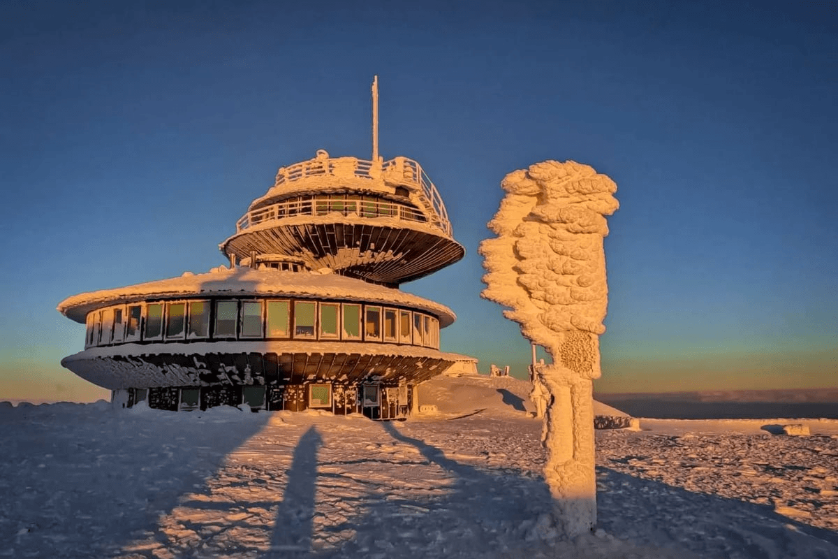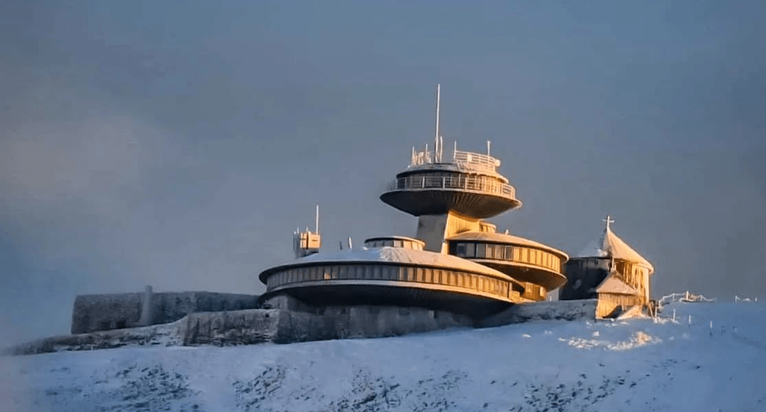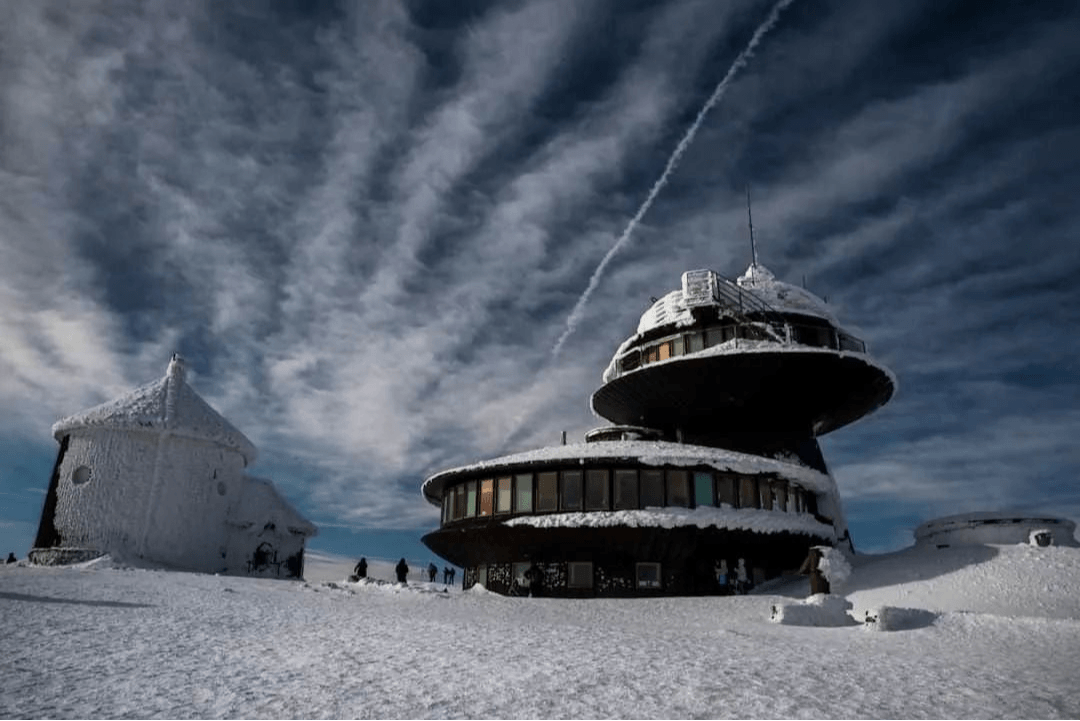 - Oryginalny budynek na szczycie Śnieżki zaprojektowali Witold Lipiński i Waldemar Wawrzyniak. Budowa trwała osiem lat. To jeden z najbardziej rozpoznawalnych powojennych obiektów w Polsce.
