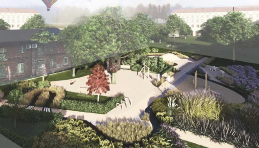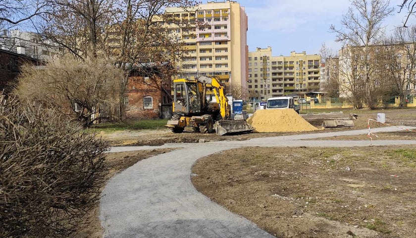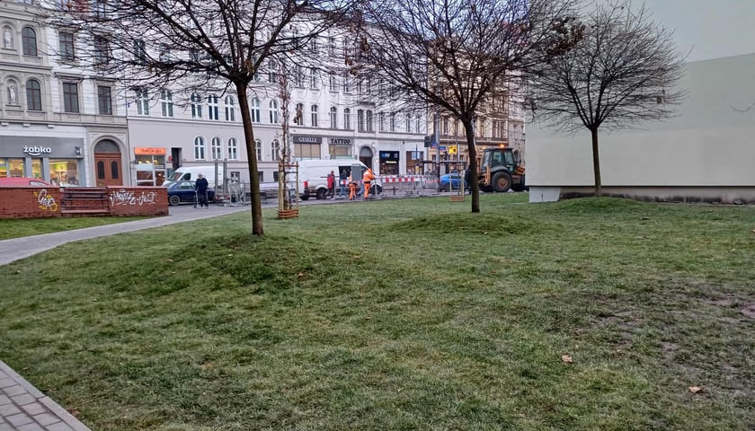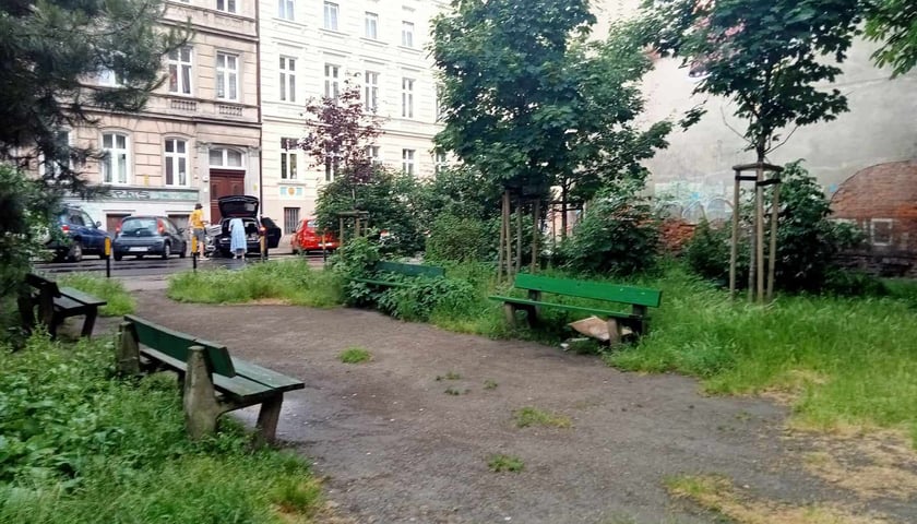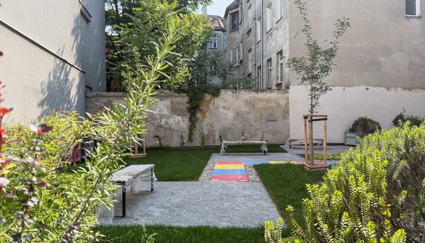 Skwer przede wszystkim został uporządkowany. Naprawiono tu ciągi piesze, rekultywowano wydeptane trawniki, dosadzono nowe drzewa do tych już tam rosnących. Ciekawą koncepcją tej przestrzeni międzyblokowej są niebieskie elementy - kwiaty coraz mała architektura w tych barwach. To nawiązanie do historycznego koloru stojącej obok kamienicy i pomysł Pracowni AKT, projektującej kluczowe zmiany na podwórku.