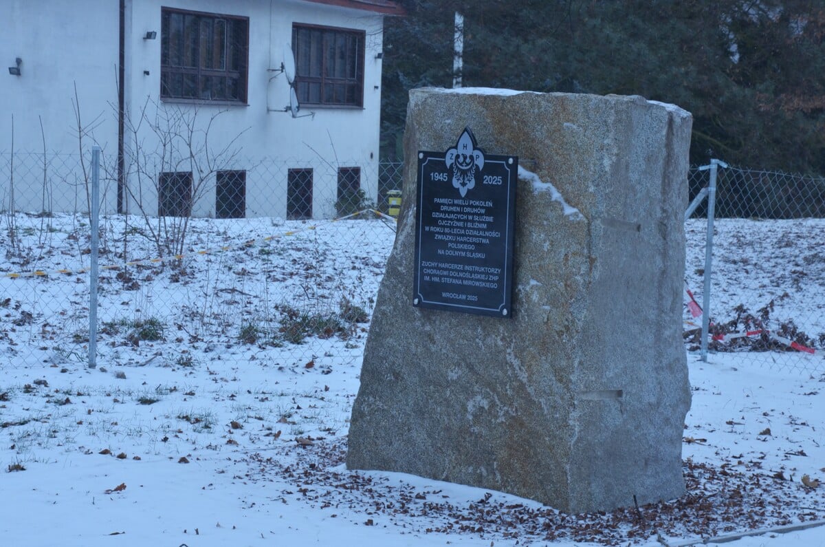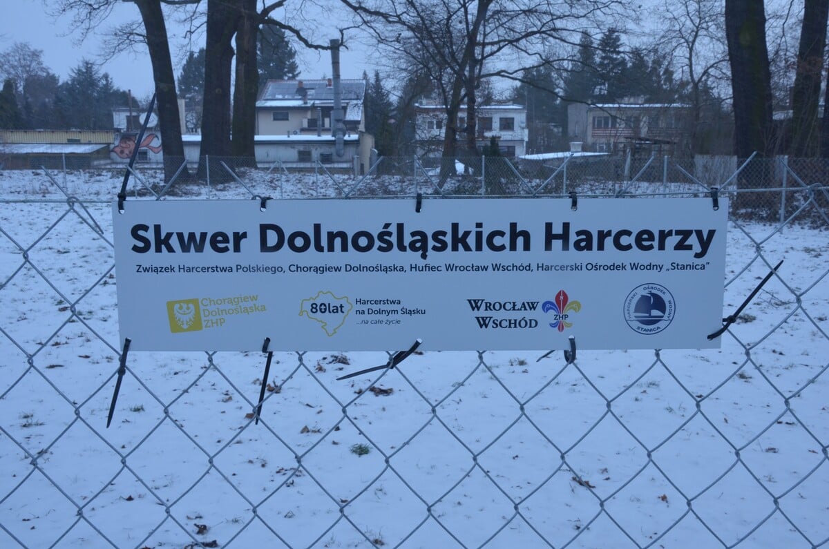 Na skwerze harcerze postawili w ubiegłym roku pomnik. Upamiętnia 80-lecie ZHP na Dolnym Śląsku. Na razie oglądać można go tylko przez płot…