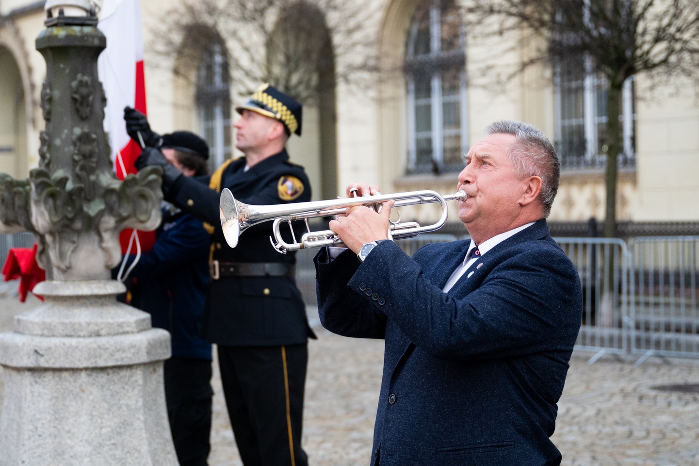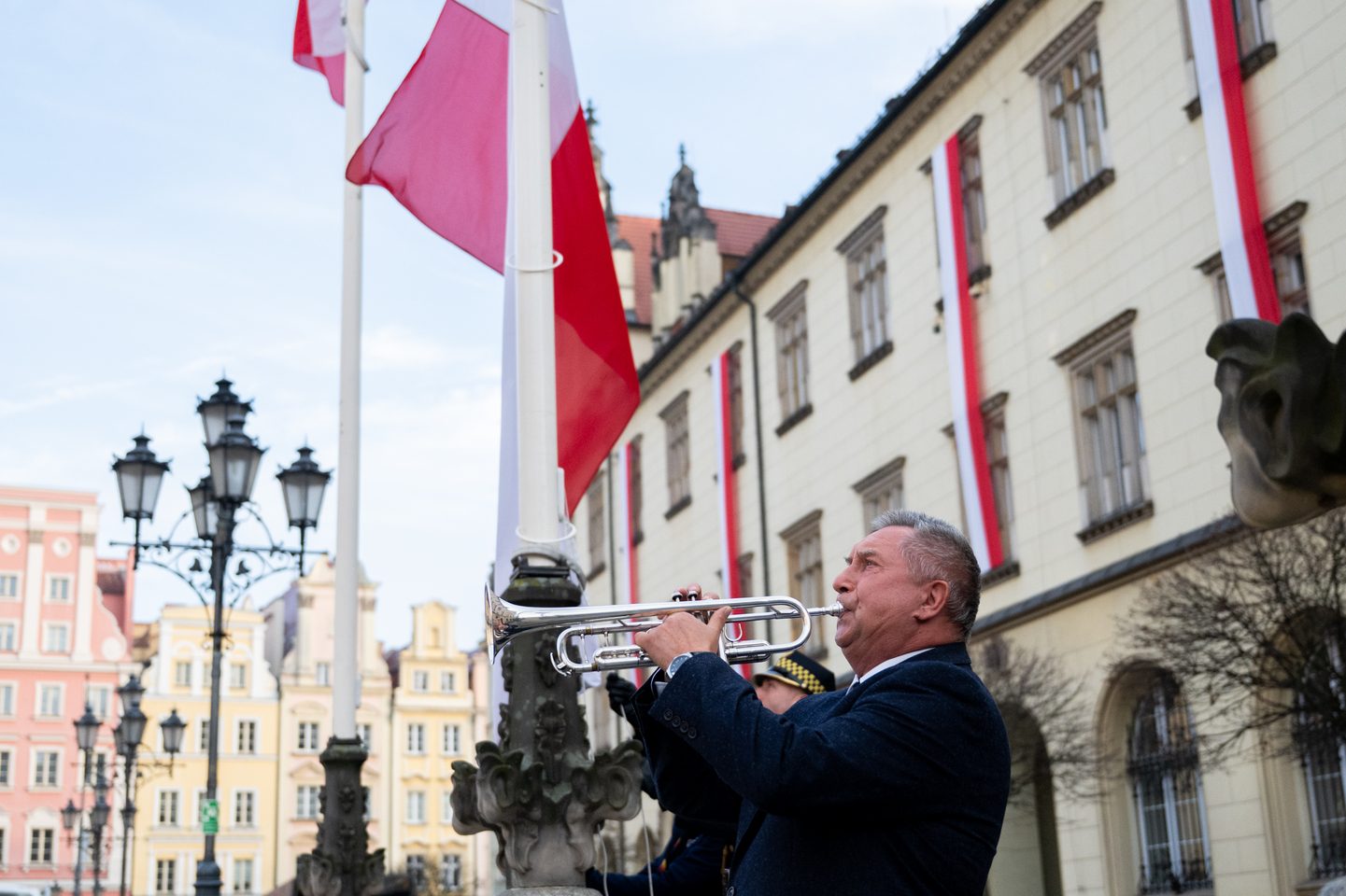 08:48Podniesienie flagi państwowej na maszt w czasie uroczystości na wrocławskim Rynku