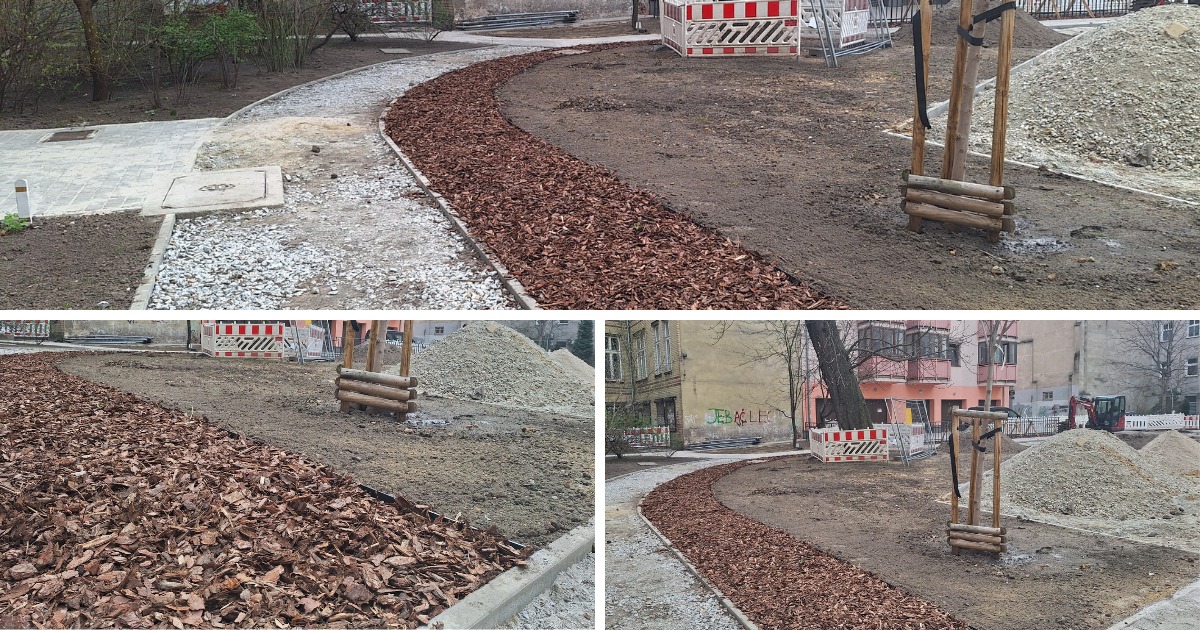 Zbitą, kurzącą się latem i rozmakająca jesienią ziemię, zastąpiły nawierzchnie mineralne, a wokół przyszłych miejsc rekreacji, wysypano mulcz. – To naturalna nawierzchnia z rozdrobnionej kory i drewna - miękka, bezpieczna i przepuszczalna dla wody. Świetnie sprawdza się w przestrzeniach rekreacyjnych i wśród zieleni. Na tym podwórku zajmie ponad 310 m² – czytamy w mediach społecznościowych ZZK.