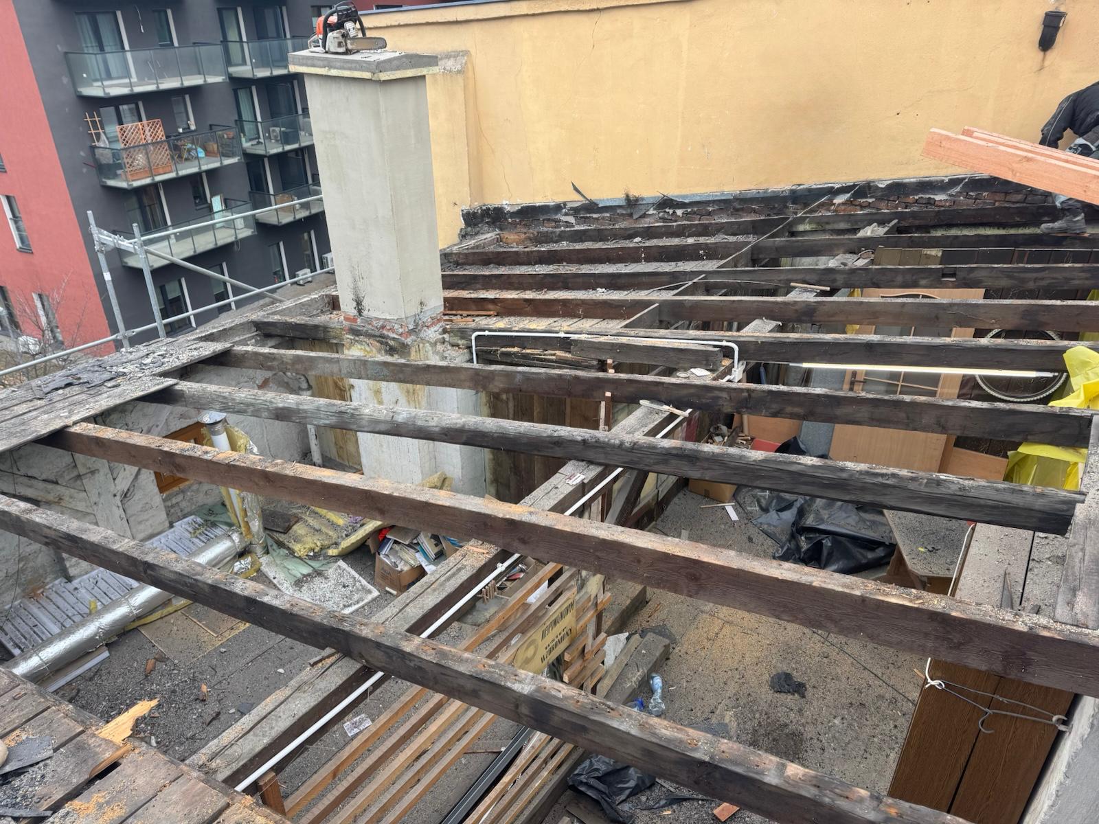 Drzewo, które spadło na dach budynku uszkodziło zarówno jego poszycie jak i konstrukcję. Mało tego, kolos zniszczył także fragment elewacji. Szkody były na tyle duże, że ZZK, w którego zasobie znajduje się budynek, zdecydował nie tylko usunąć skutki wichury, ale także wzmocnić całą konstrukcję dachu.