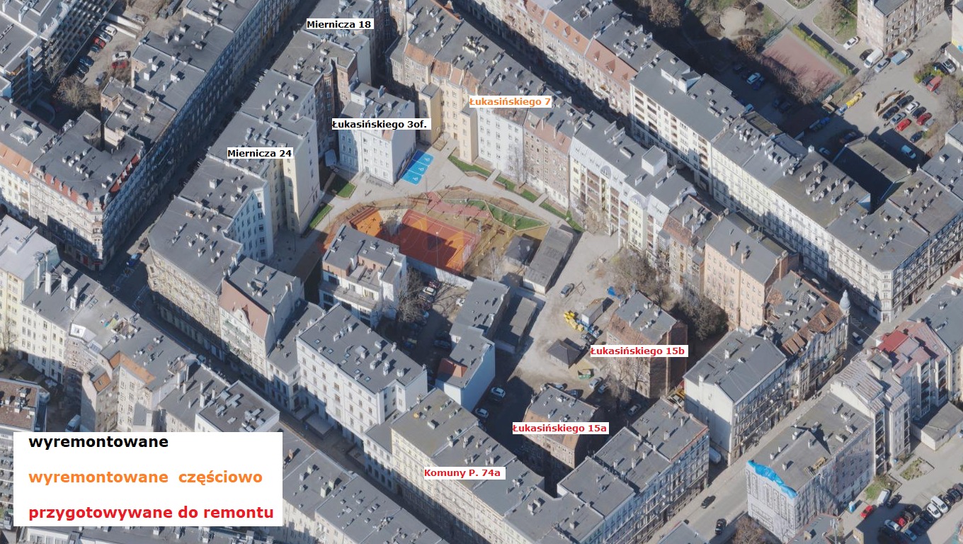 Niezależnie od remontu tego wnętrza, Zarząd Zasobu Komunalnego remontuje budynki w 100 proc. miejskie, które do niego przylegają. Jeszcze w tym roku ruszy pierwszy etap remontu kamienicy przy Komuny Paryskiej 74a (prace rozpisane do 2027). W przyszłym roku ruszy także remont dwóch oficyn, stojących w remontowanej części wnętrza: Łukasińskiego 15 a i 15 b.
